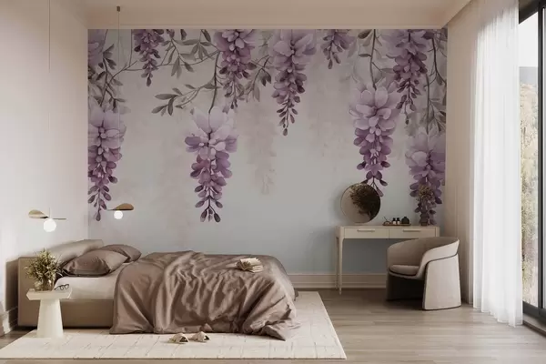 Peintures murales Délicates et larges branches de lavande suspendues au mur, imitation aquarelle Nr. w09690