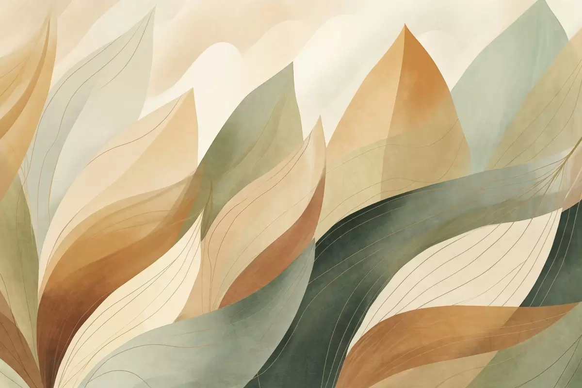Peintures murales Feuilles abstraites, tons terreux discrets de vert et d'orange avec des détails délicats, texture douce de l'aquarelle. Nr. w09736