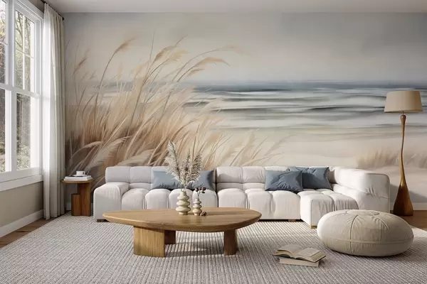 Peintures murales Paysage texturé avec de l'herbe sèche sur une plage de sable, avec l'océan et le ciel en arrière-plan Nr. w09739