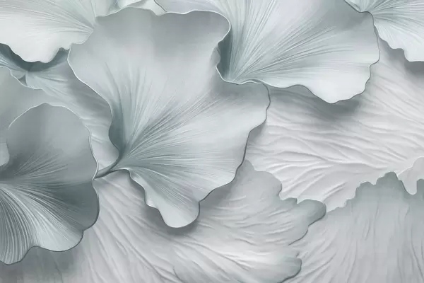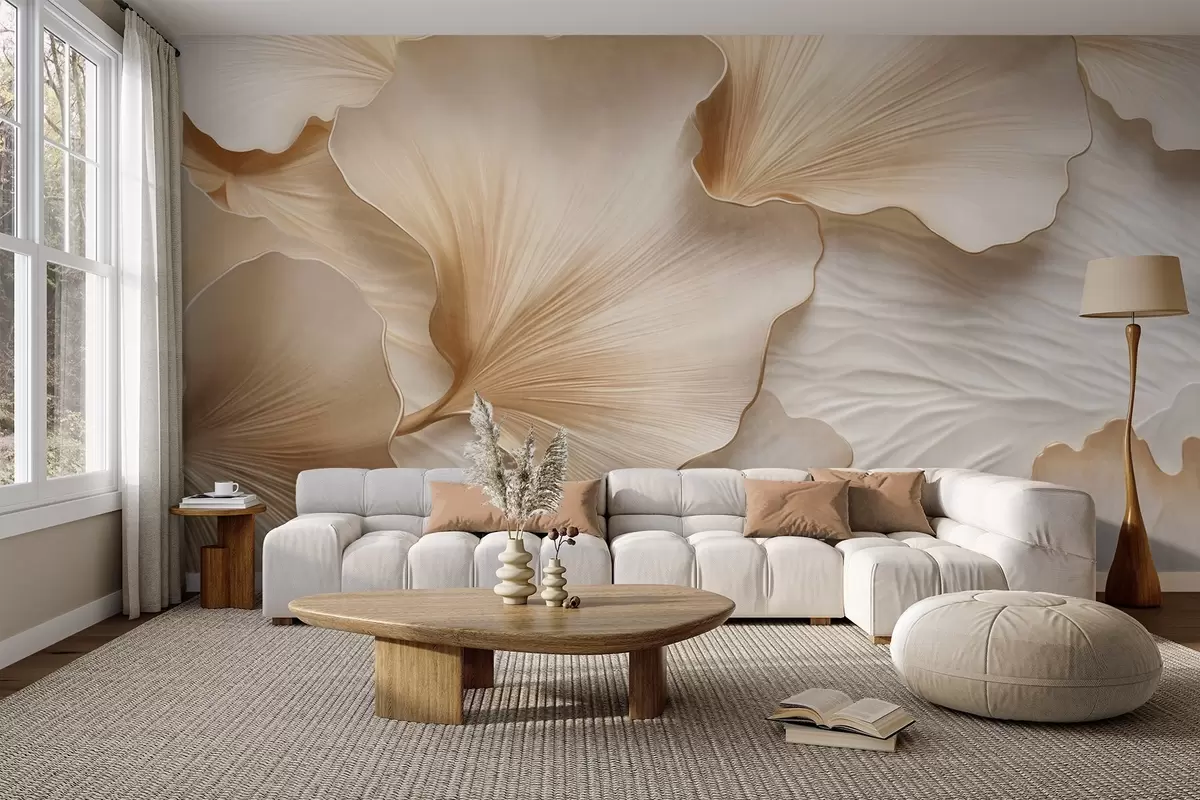Peintures murales Pétales de feuilles de ginkgo texturées, beiges et blanches, avec un imprimé organique délicat. Nr. w09741