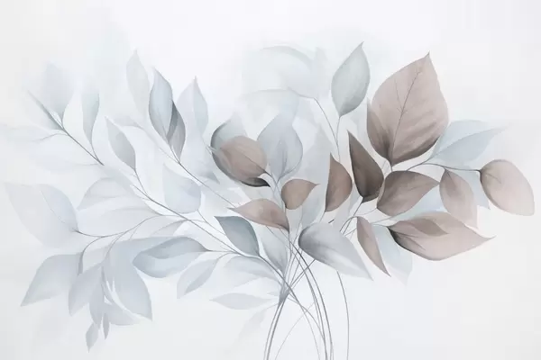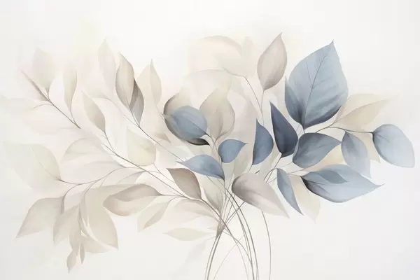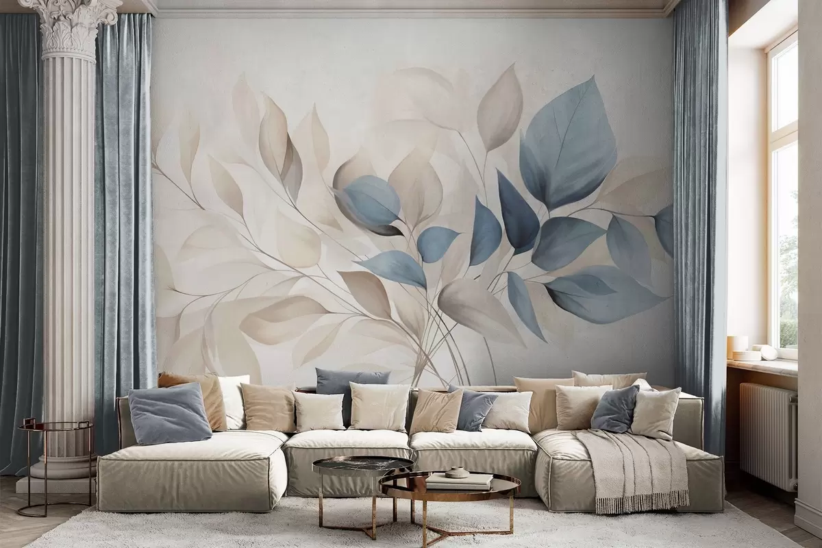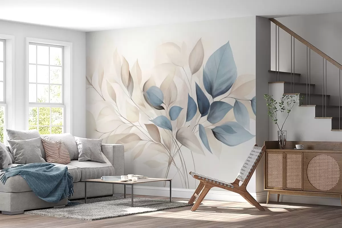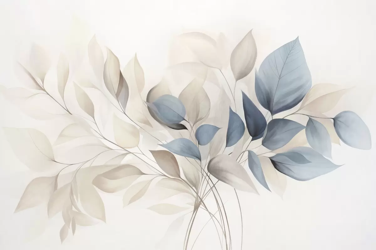 Peintures murales Feuilles abstraites translucides dans des tons de bleu, beige et crème, art texturé Nr. w09744