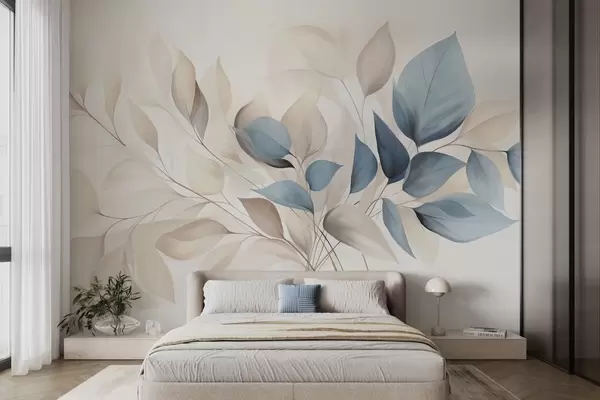 Peintures murales Feuilles abstraites translucides dans des tons de bleu, beige et crème, art texturé Nr. w09744