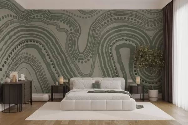Peintures murales Lignes ondulées et points abstraits verts et beiges, art moderne texturé Nr. w09747