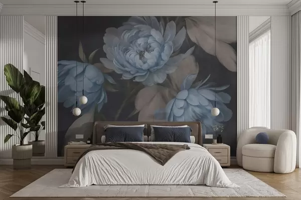 Peintures murales Des fleurs de pivoine bleu clair texturées, accompagnées de feuilles beiges, sur un fond sombre Nr. w09751