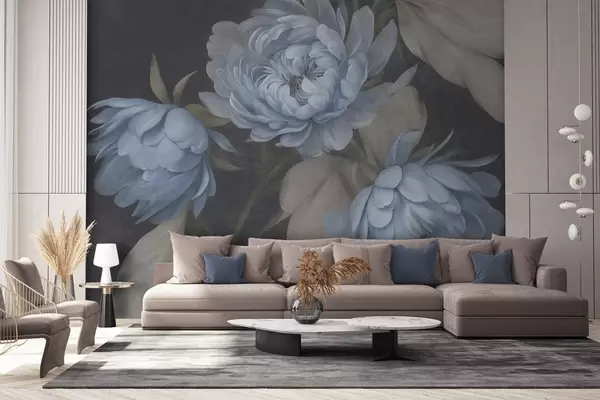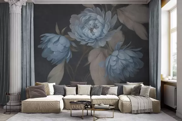 Peintures murales Des fleurs de pivoine bleu clair texturées, accompagnées de feuilles beiges, sur un fond sombre Nr. w09751