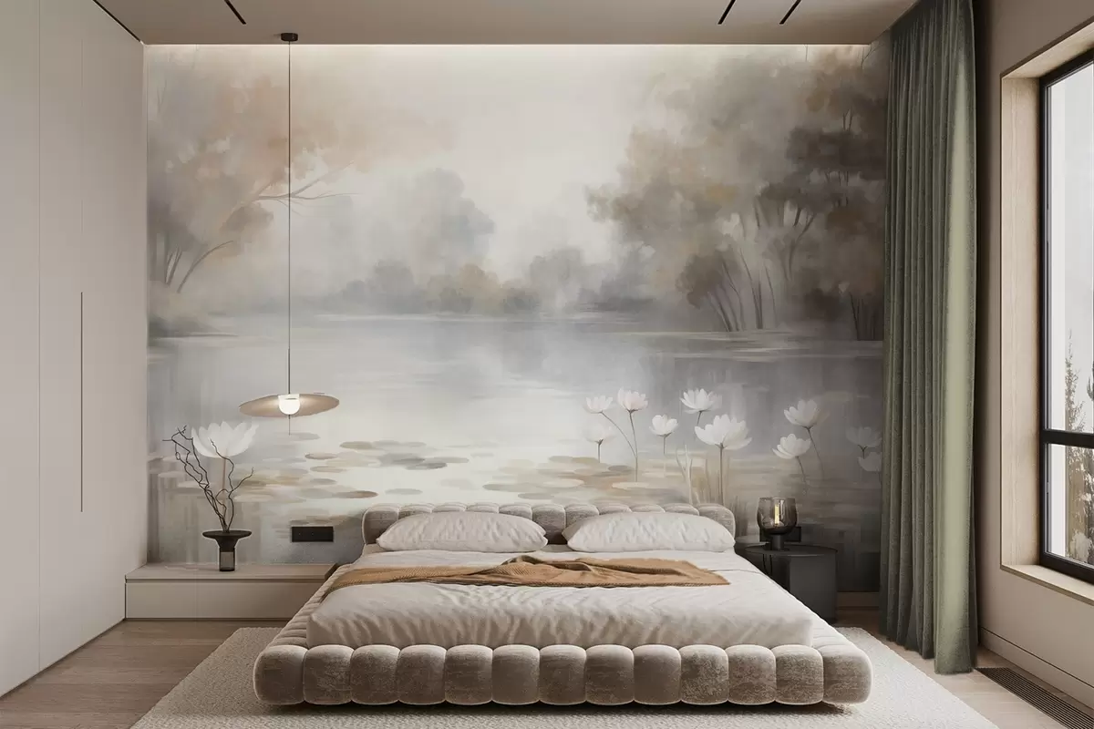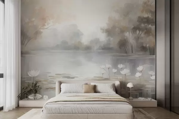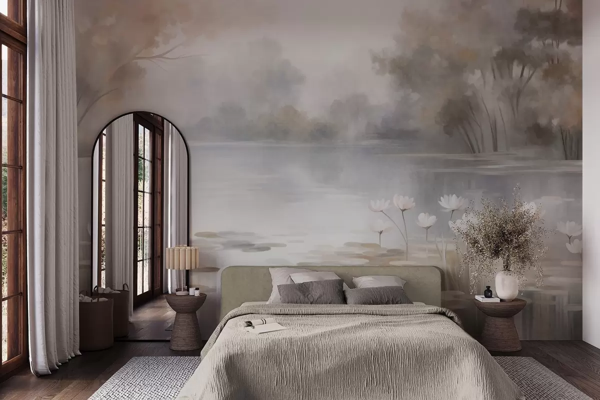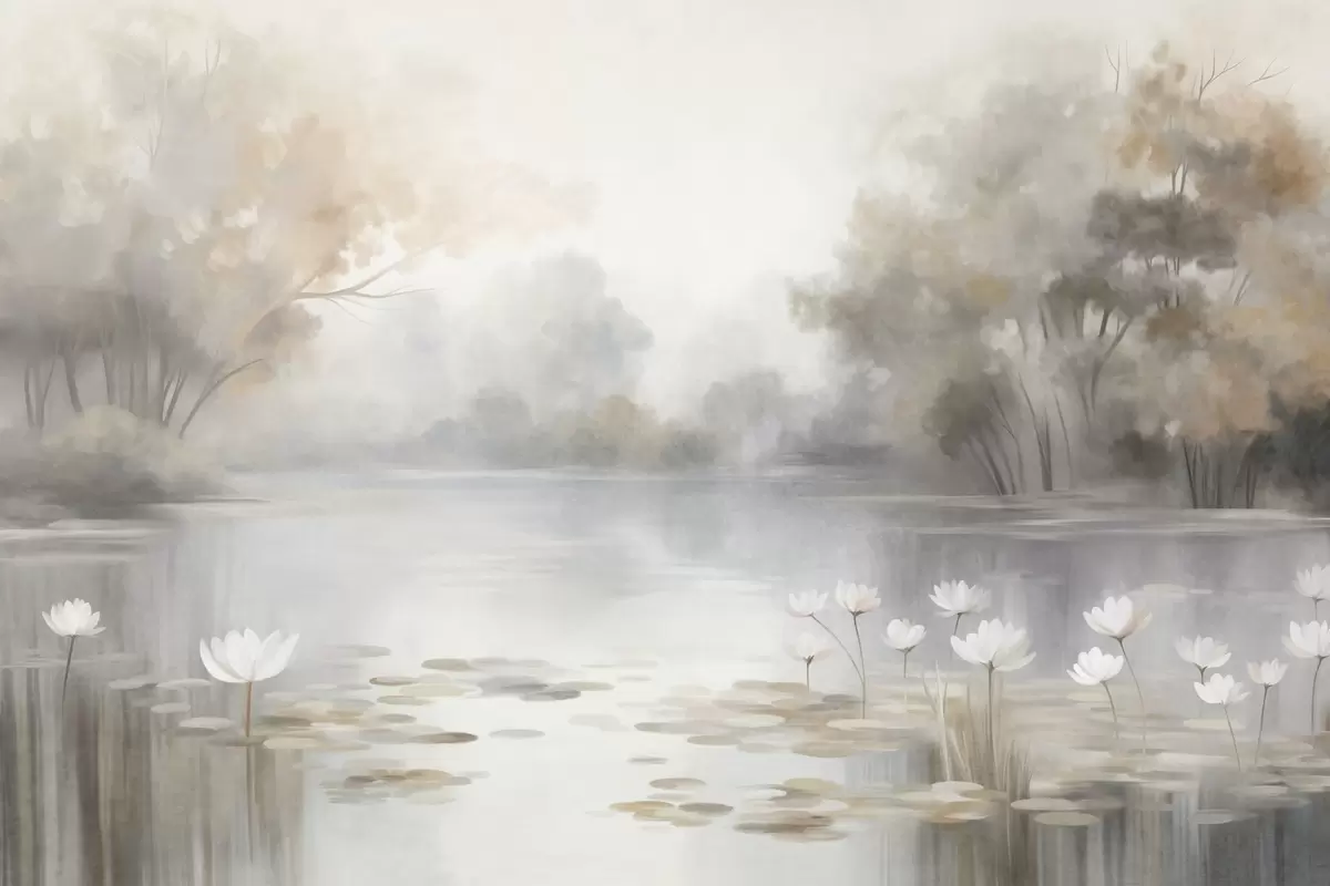 Peintures murales Paysage aux reliefs variés, lac parsemé de nénuphars blancs, entouré d'arbres aux couleurs douces Nr. w09768