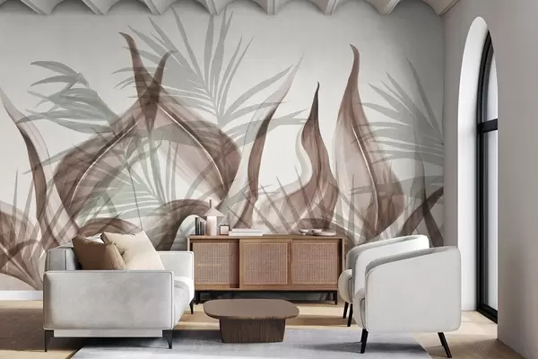 Peintures murales Feuilles tropicales dans des tons de brun et de vert sur fond blanc, style aquarelle texturé Nr. w09772