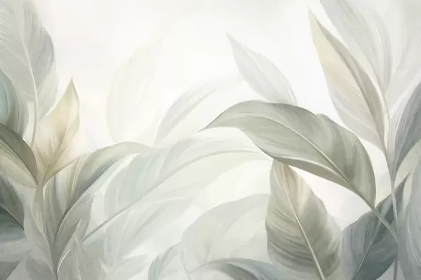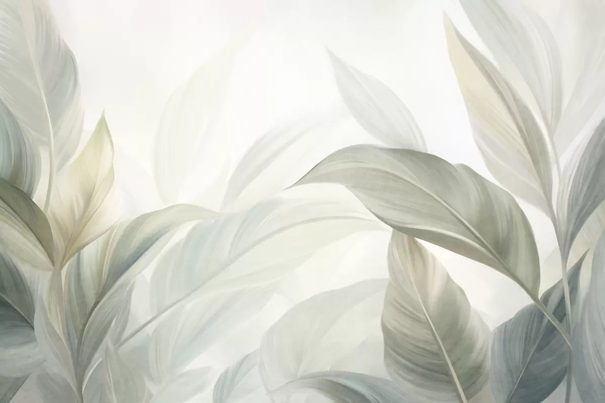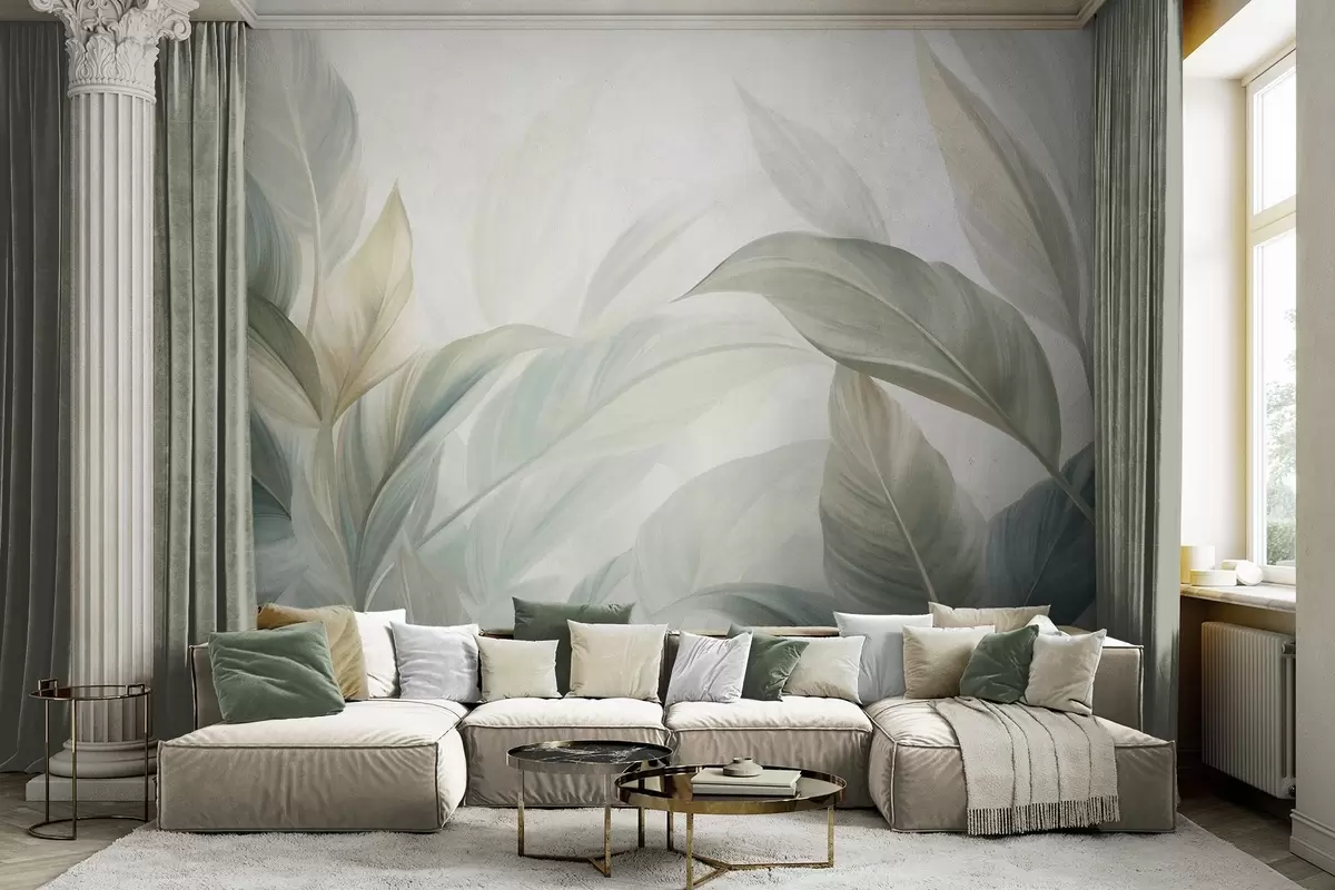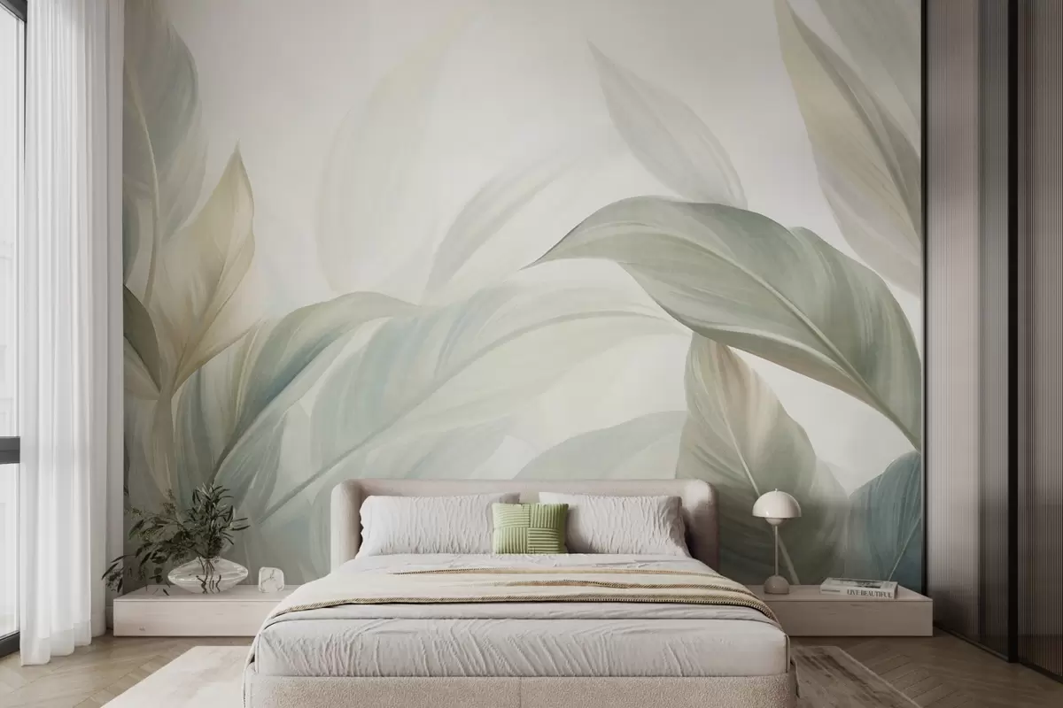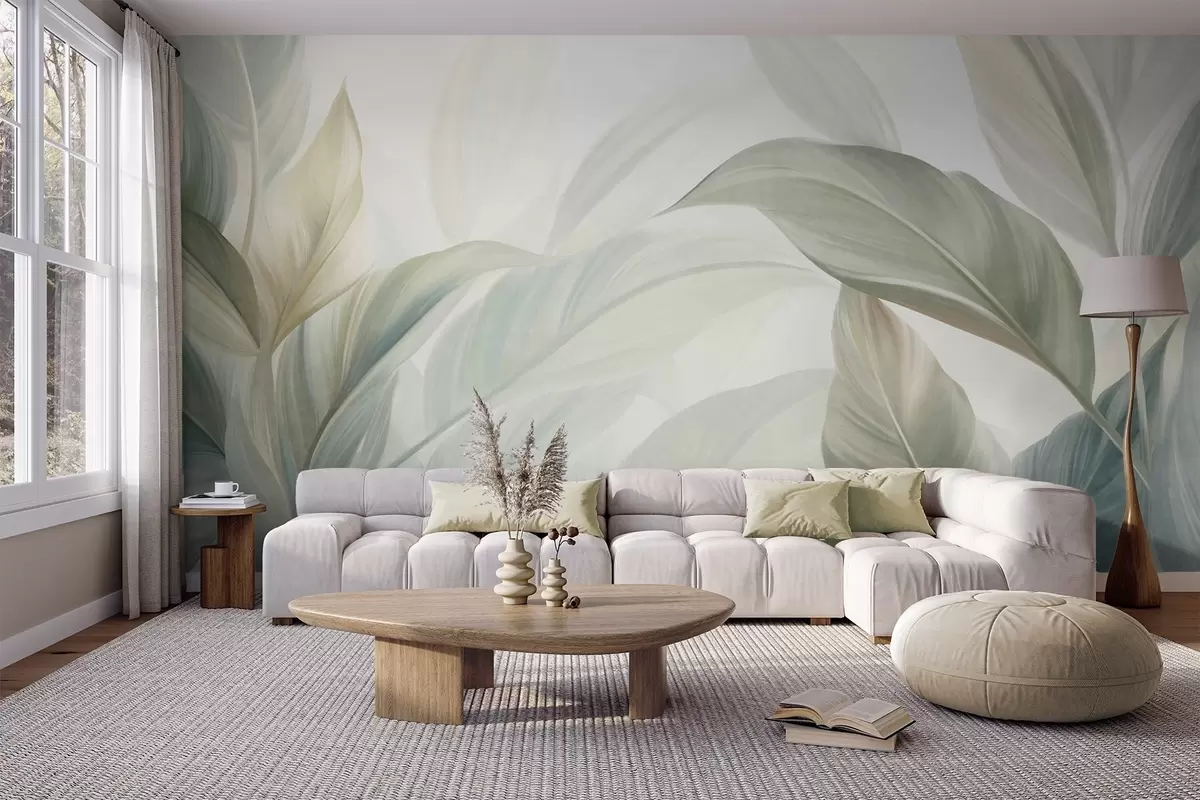 Peintures murales De grandes feuilles tropicales vert pâle aux couleurs douces et pastel, dans un style artistique texturé Nr. w09816