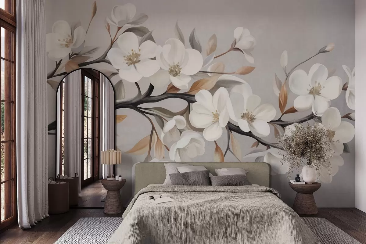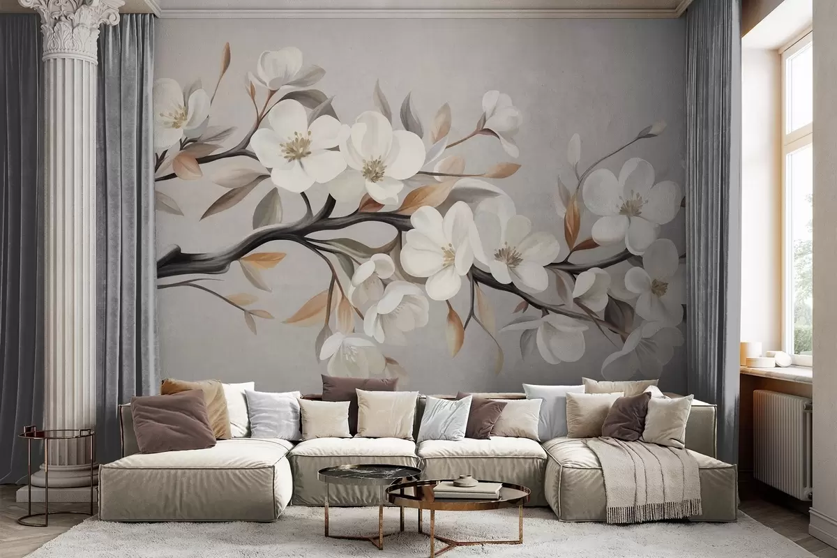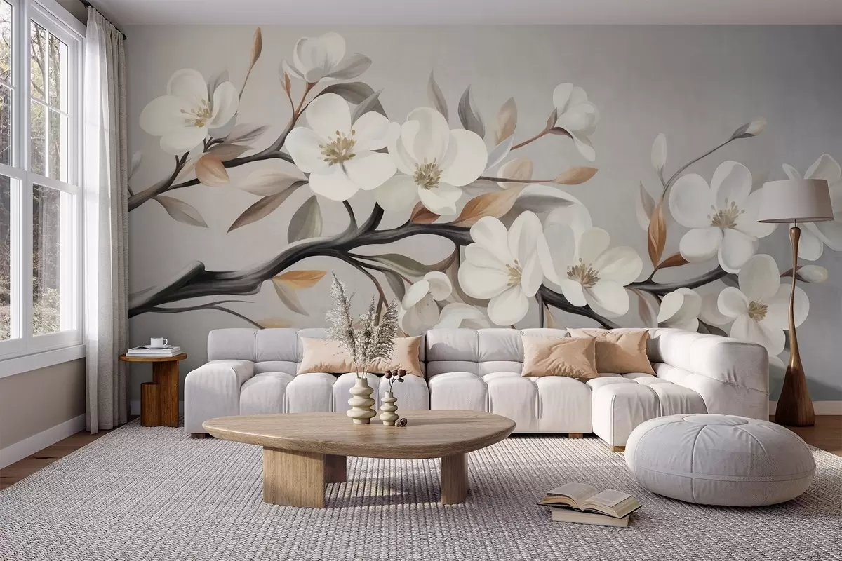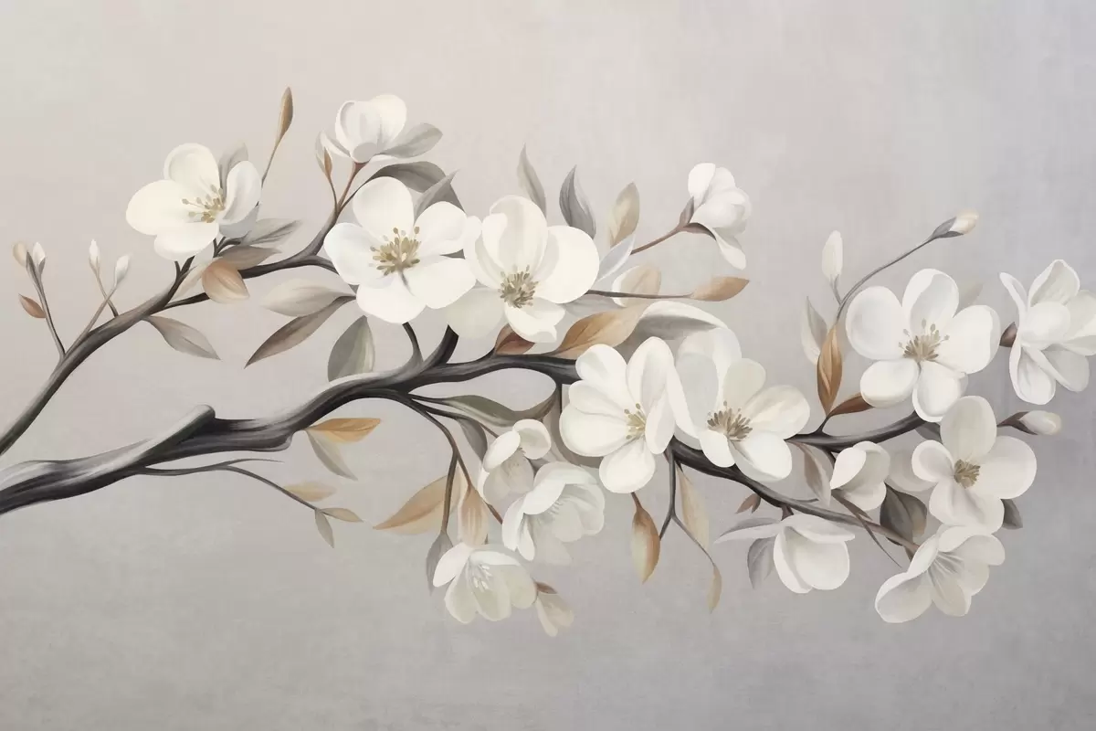 Peintures murales Une branche texturée avec des fleurs blanches et des feuilles brunes sur fond gris clair Nr. w09817