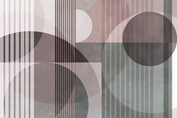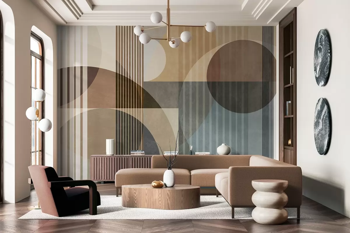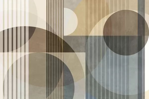 Peintures murales Formes géométriques abstraites composées de cercles et de lignes, dans des tons ocres discrets, avec une composition texturée et superposée Nr. w09834