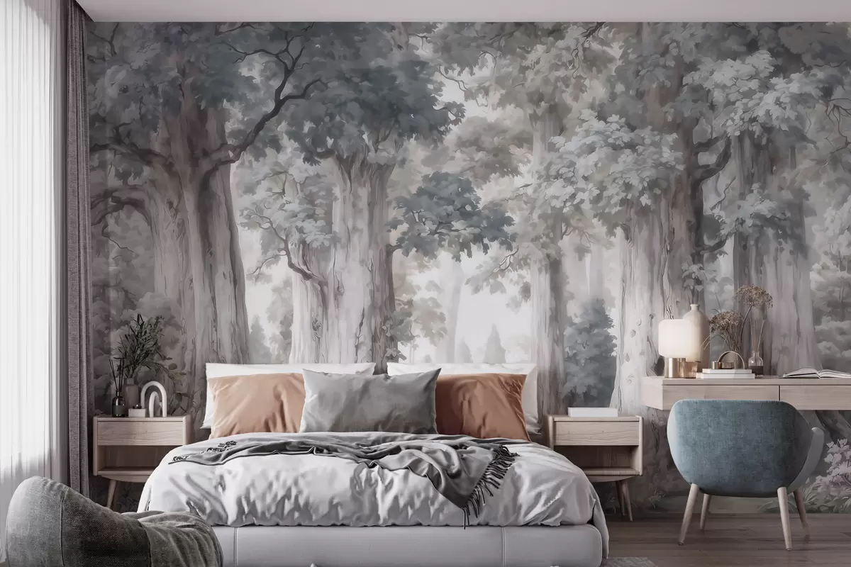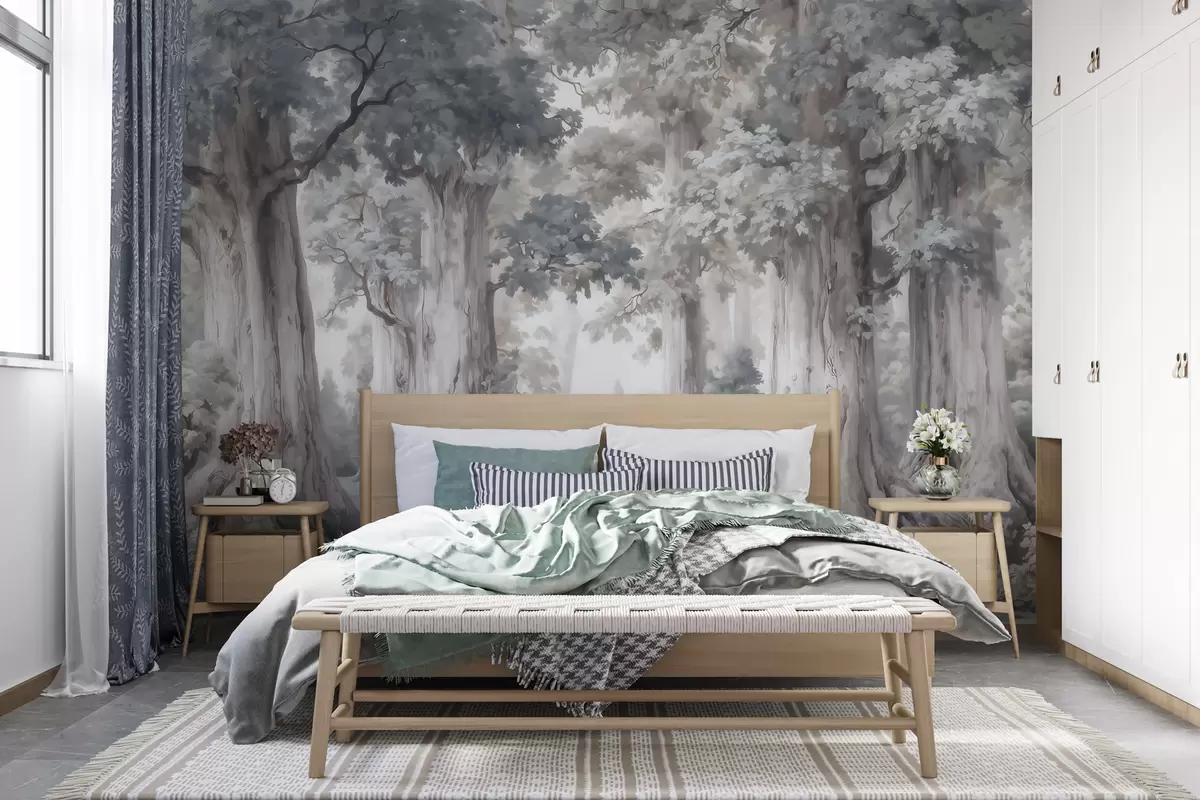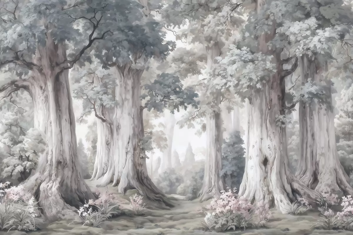 Peintures murales Une forêt féérique avec de grands arbres et une palette de couleurs douces et discrètes, dans un style aquarelle Nr. w09849
