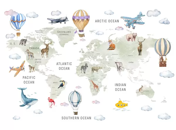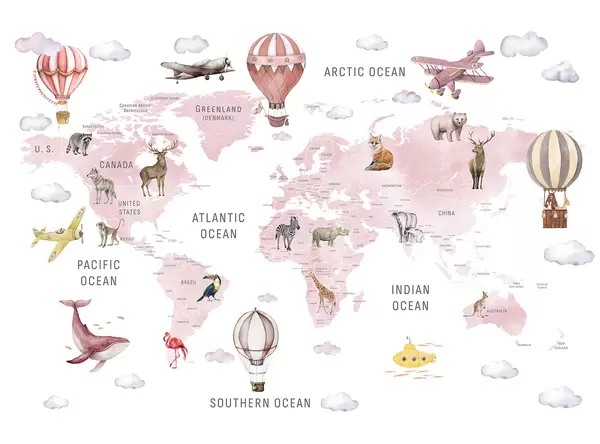 Wall murals Children's map in watercolour style with animals and hot air balloons. English language. Pink colour. Nr. c00001env3