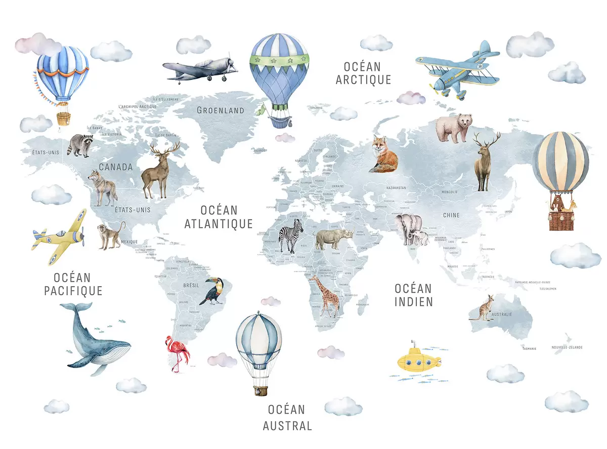 Wall murals Children's map in watercolour style with animals and hot air balloons. French language. Blue colour. Nr. c00001frv1