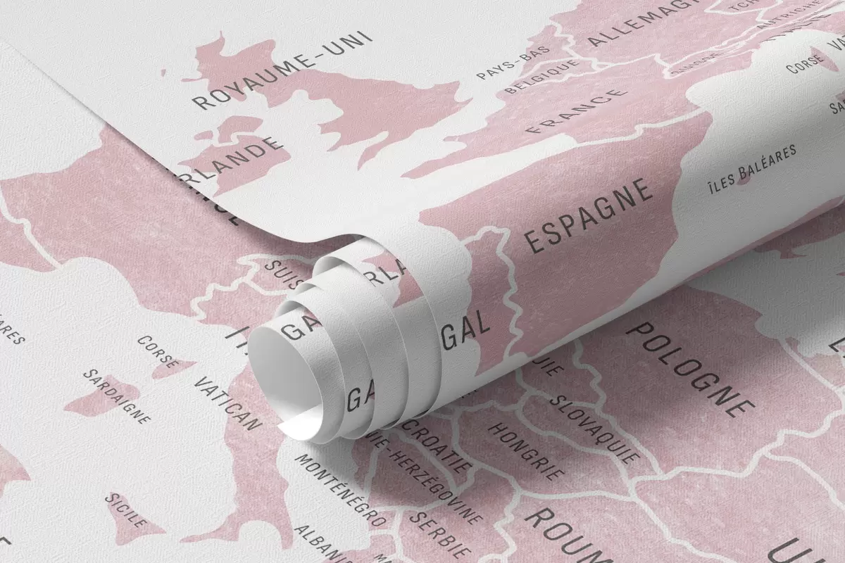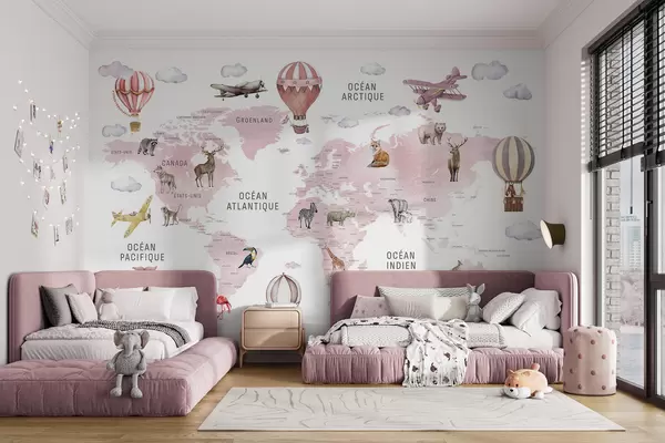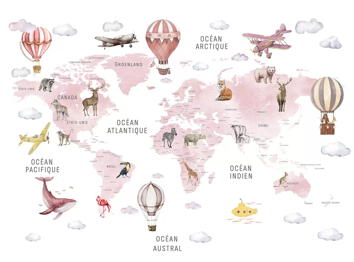 Wall murals Children's map in watercolour style with animals and hot air balloons. French language. Pink colour. Nr. c00001frv3
