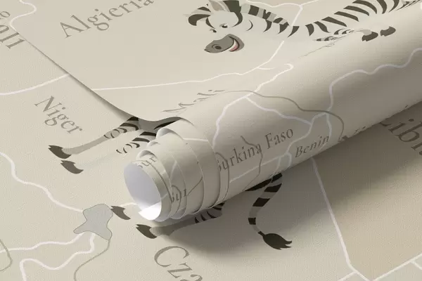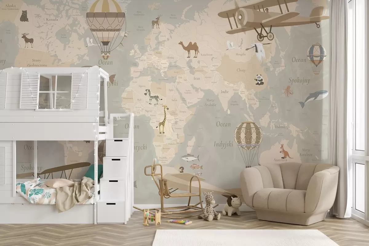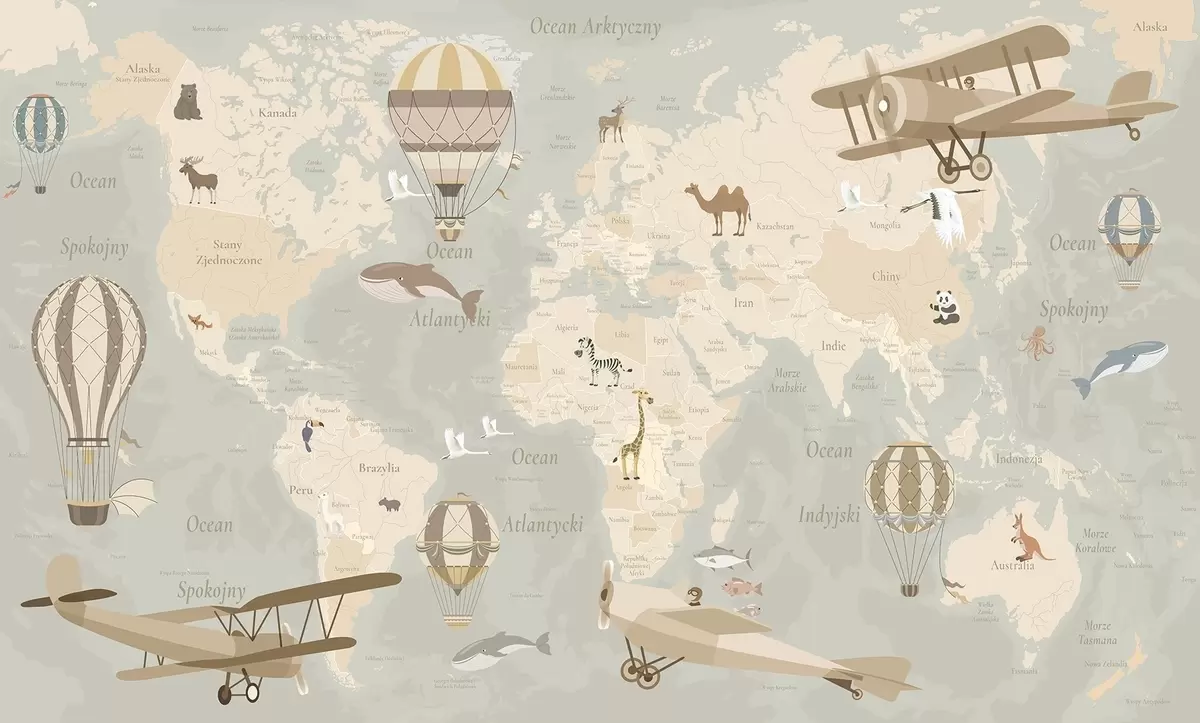 Wall murals Children's world map with animals, airplanes, and hot air balloons. Polish language. Beige color Nr. c00003pl