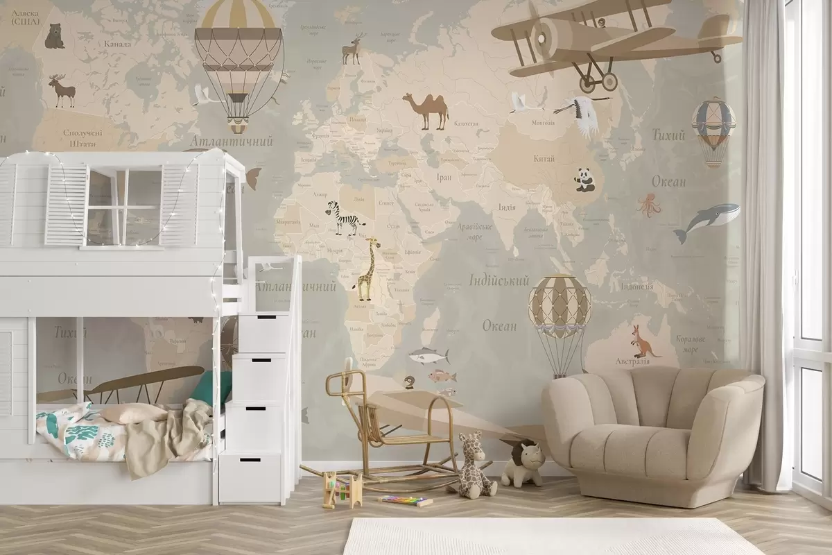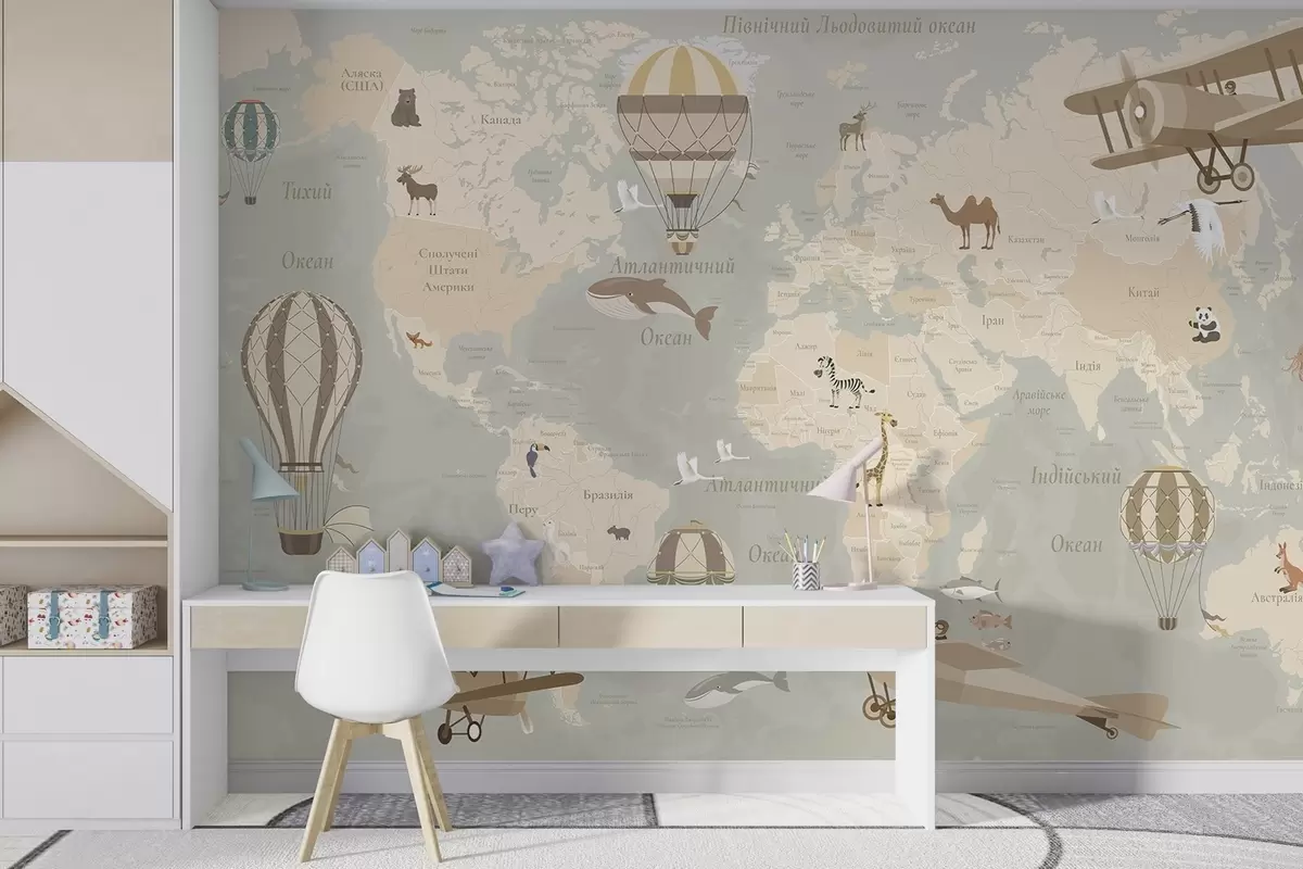 Wall murals Children's world map with animals, airplanes, and hot air balloons. Ukrainian language. Beige color Nr. c00003uk