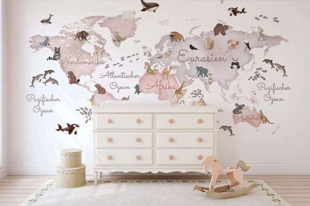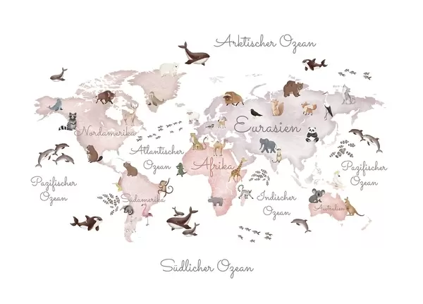 Wall murals A watercolor-style Beige map featuring animals. Labels in German Nr. c00012dev3