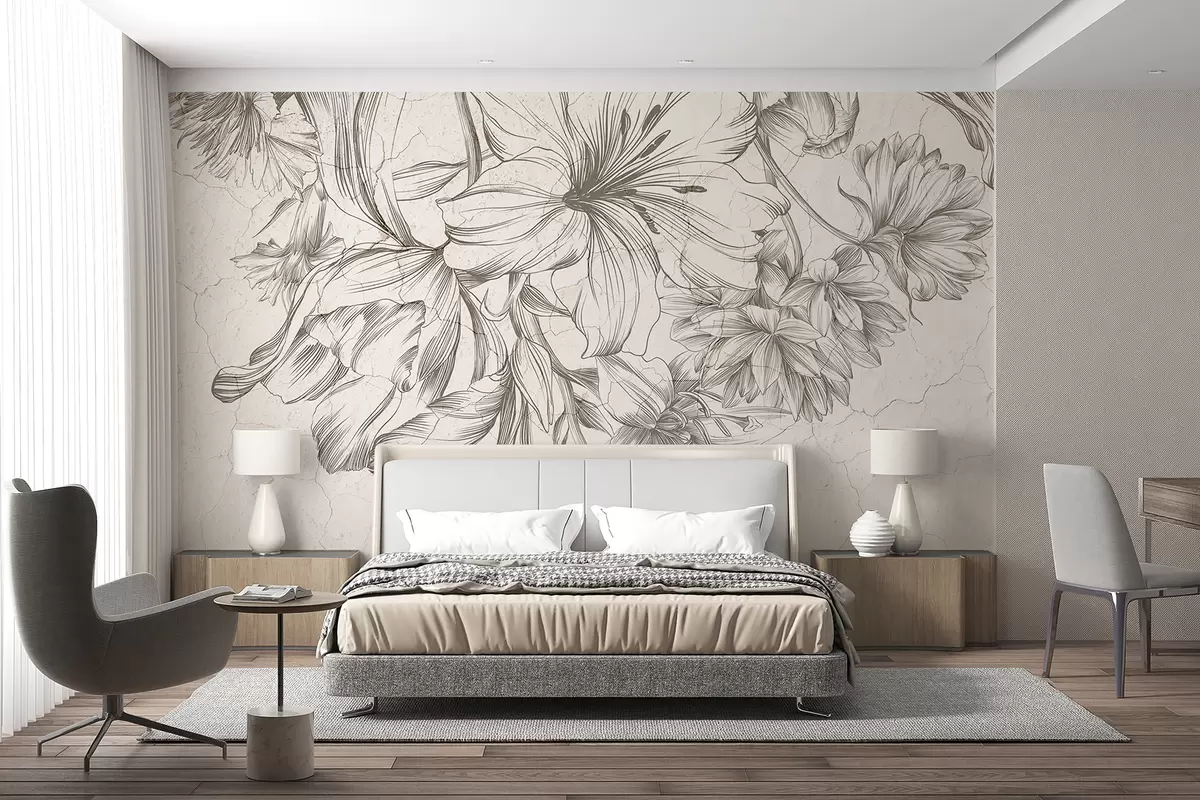 Wall murals A black and white sketch grawing of large flowers graphic print Nr. w01253