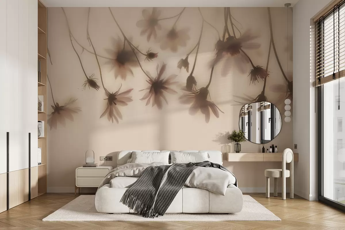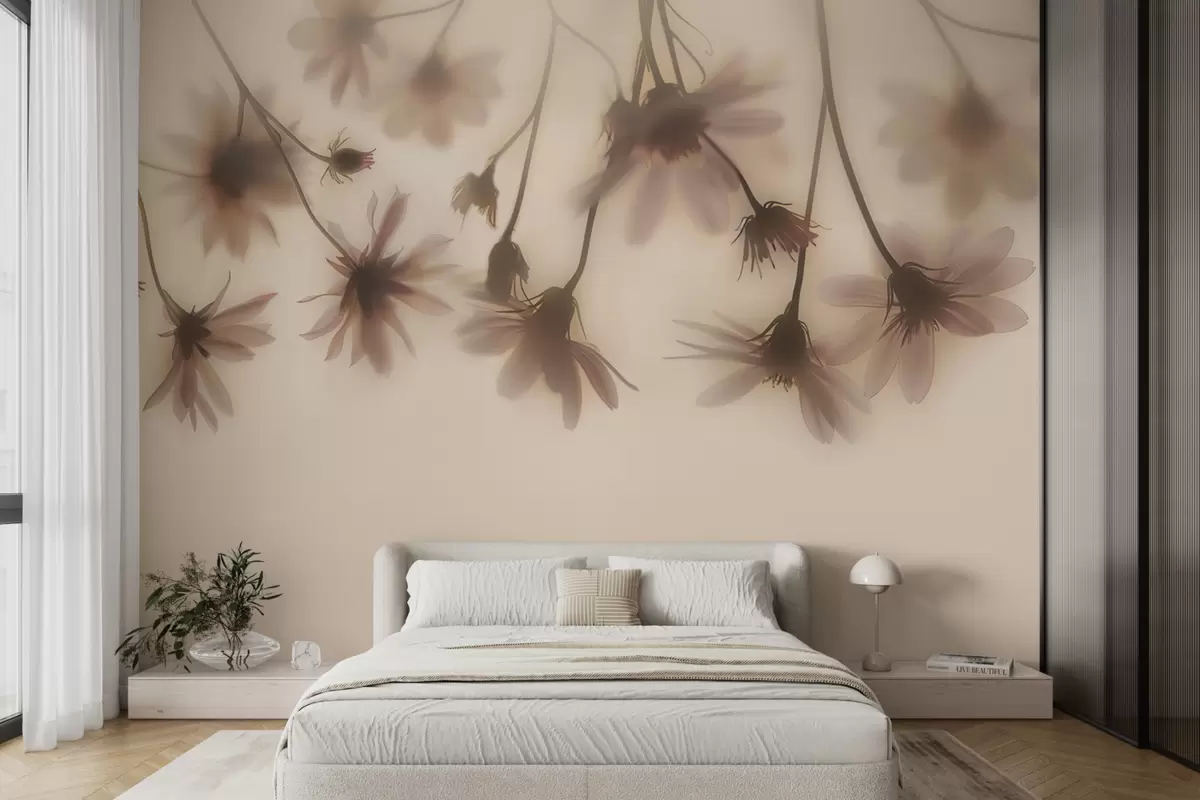 Wall murals Delicate flowers in the fog hanging from above in pink colors Nr. w01469