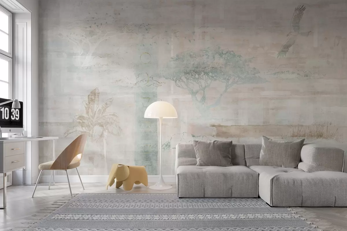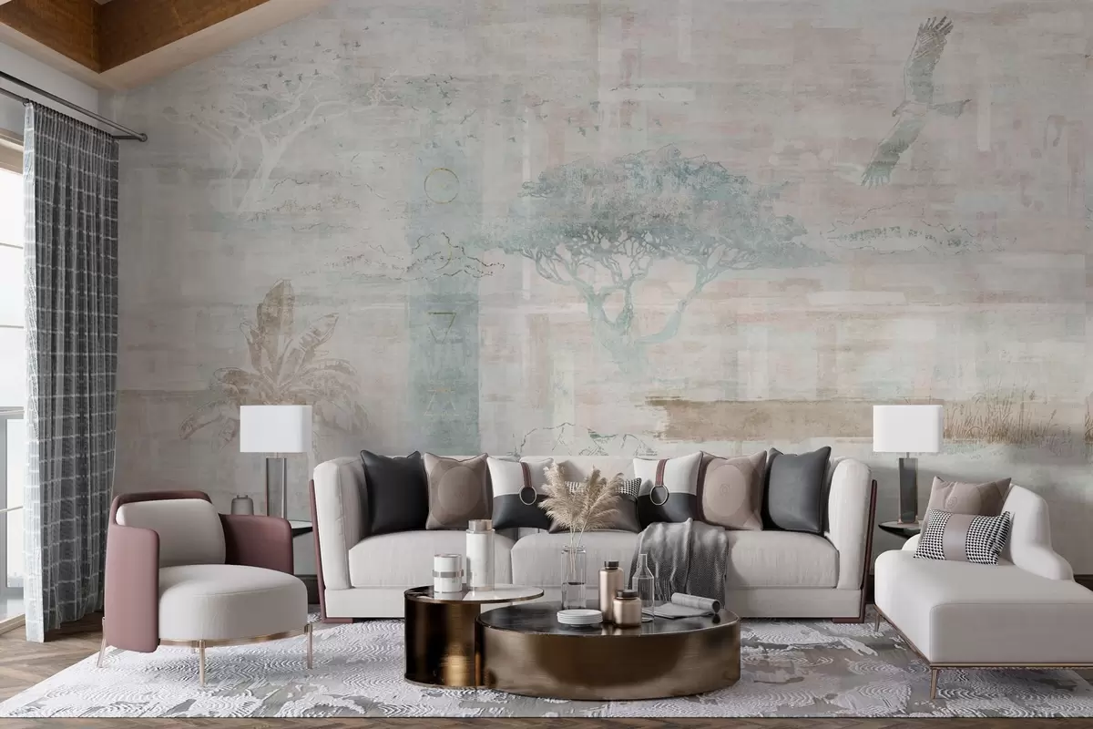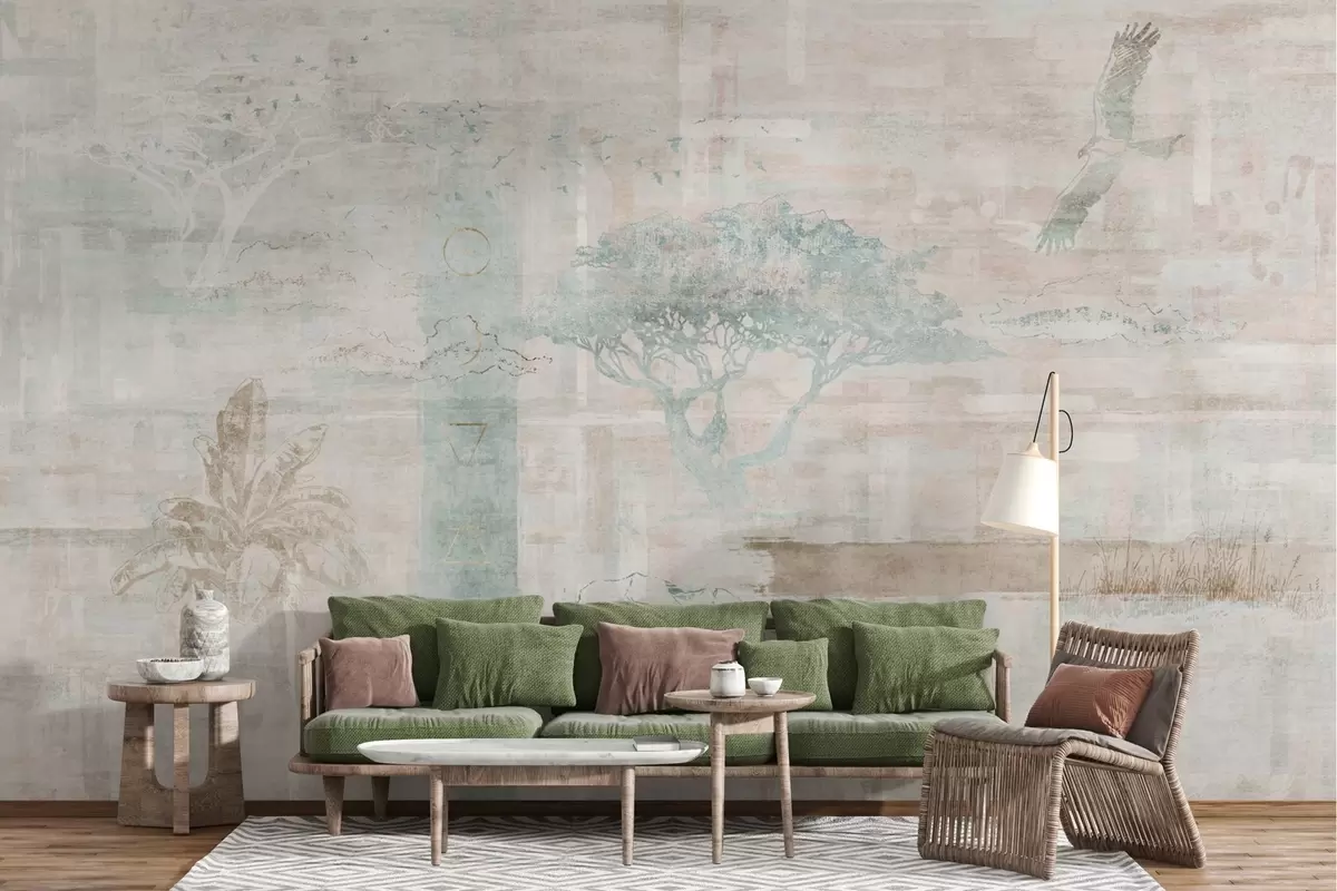 Wall murals Vintage grunge effect design with trees, eagle and geometric elements Nr. w02130