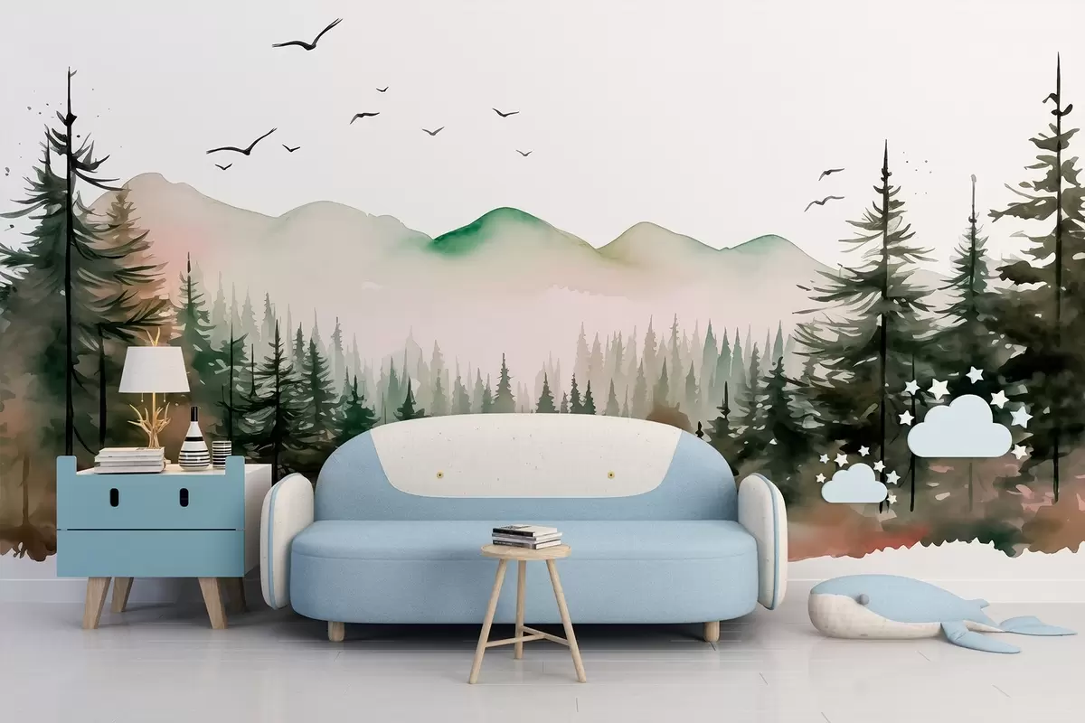 Wall murals Watercolor forest and mountain landscapes, green and pink colors Nr. w02150v1