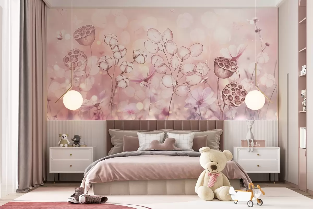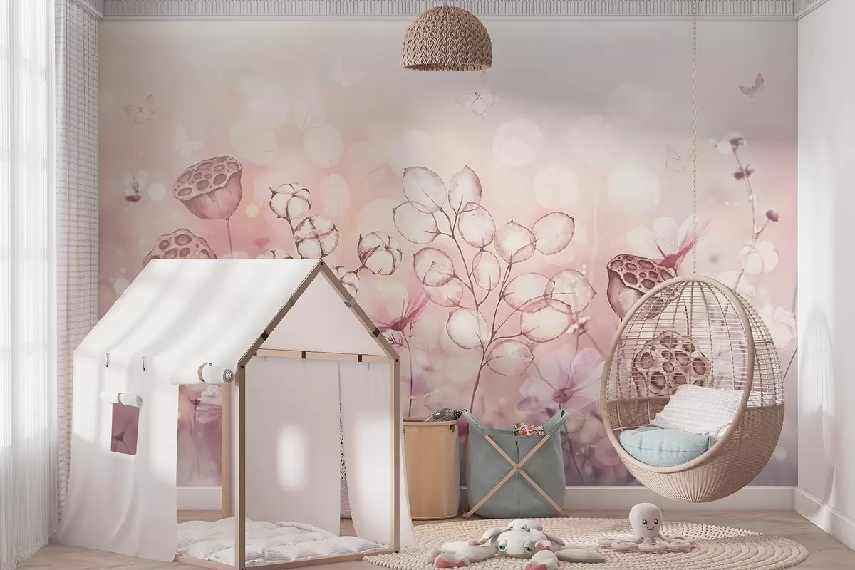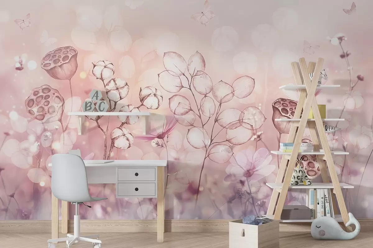 Wall murals Dreamy flower garden, butterfly, cotton flowers, lotuses, pink colors Nr. w02516