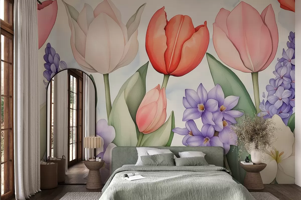 Wall murals Spring flowers, tulips, hyacinth, watercolor style drawing, floral Nr. w02940