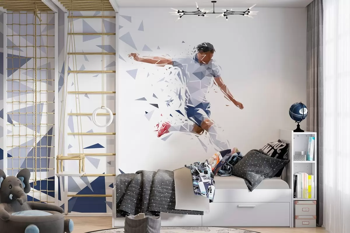 Wall murals Dynamic footballer in a low-poly style, hitting the ball Nr. w03289