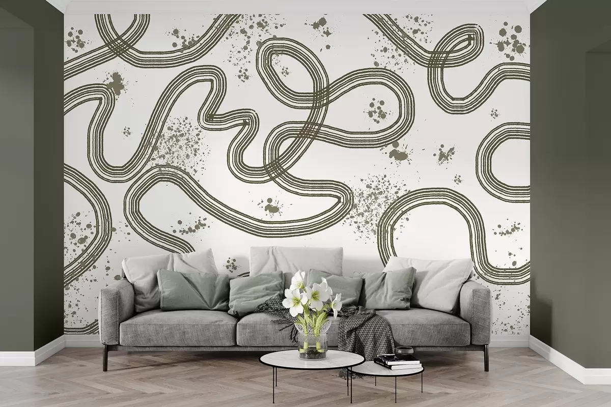 Wall murals Line art drawing, paint splatters, minimalism, olive color Nr. w03408