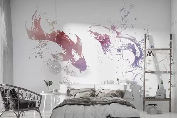 wall murals Watercolor fish, oriental style, cherry tree, purple colors w03447v1