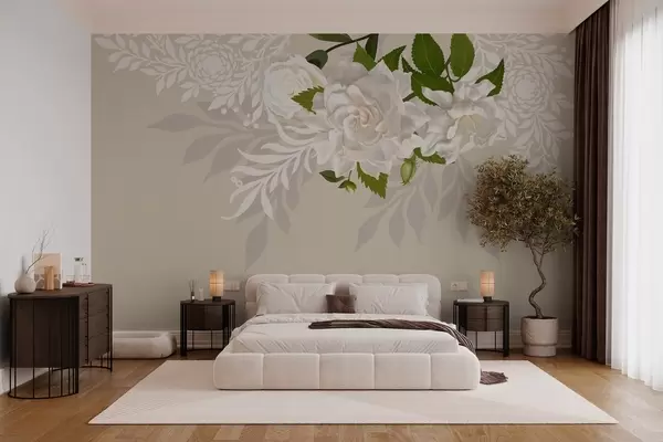 Wall murals white roses on a beige patterned background Nr. w03453