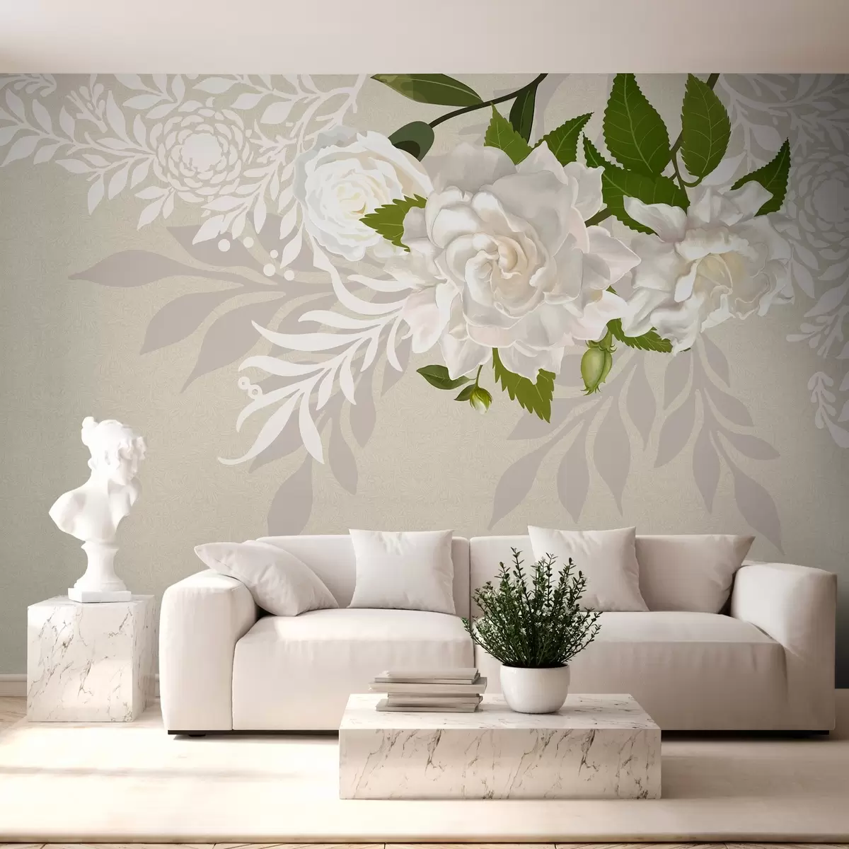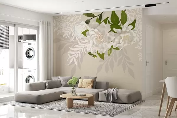 Wall murals white roses on a beige patterned background Nr. w03453