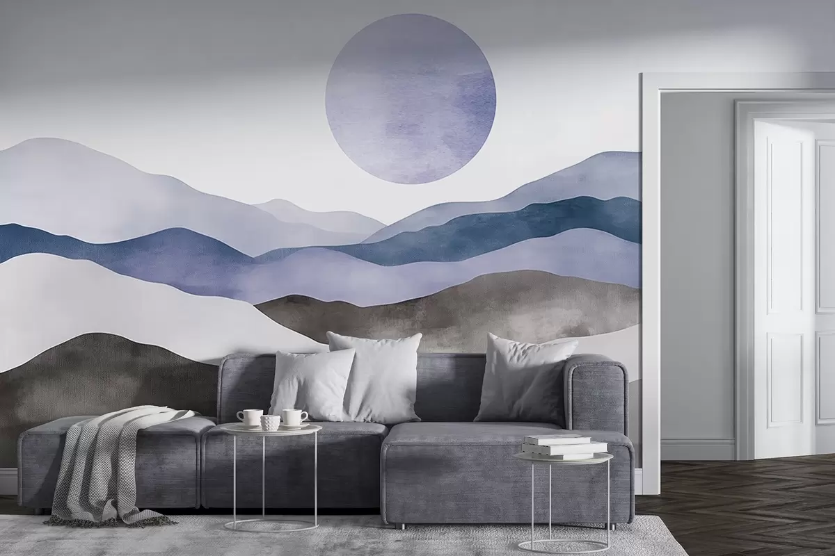 Wall murals Watercolor mountains with the Sun, boho style, purple, blue, grey Nr. w03551v1