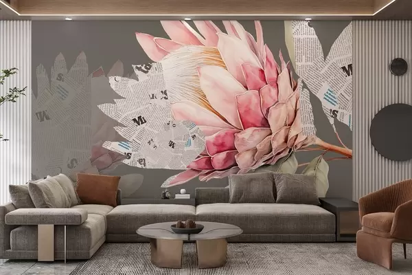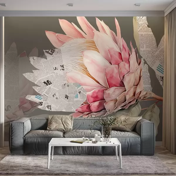 Wall murals Protea flowers, newspaper art, floral, tropical, green background Nr. w03667v1