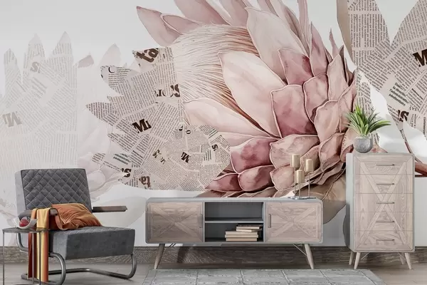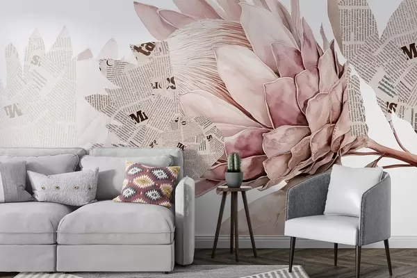 Wall murals Protea flowers, newspaper art, floral, tropical, pastel beige colors Nr. w03667v4