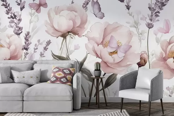 wall murals Flower meadow, peonies, lavender, butterflies, watercolor style, pink colors w03668