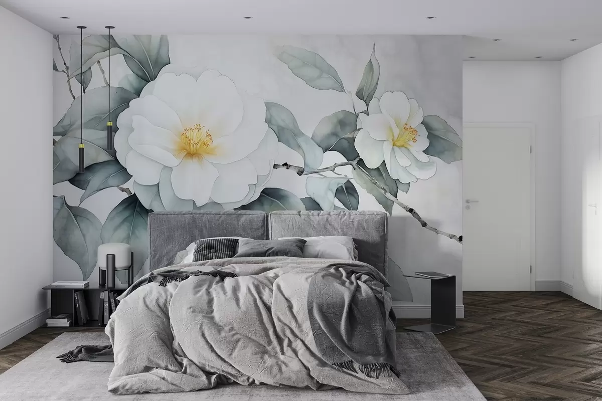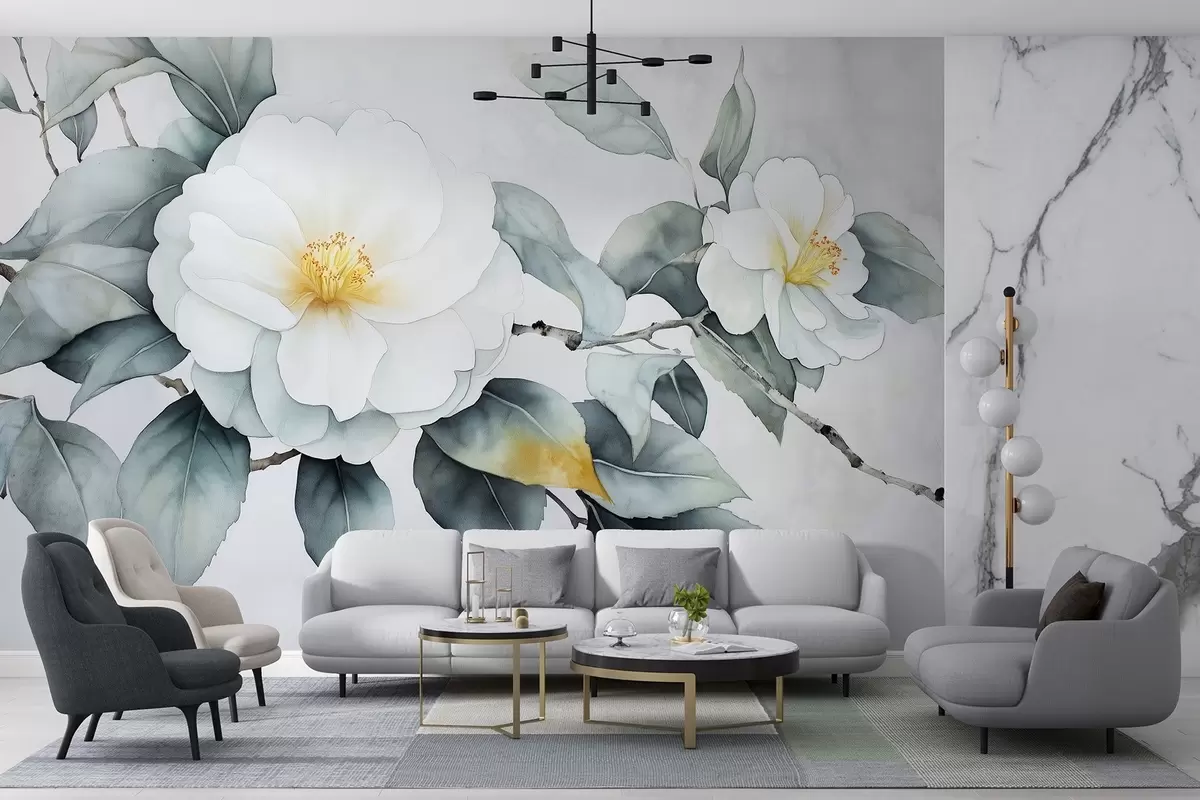Wall murals Watercolor style camellia flowers on the branch, natural colors Nr. w03761