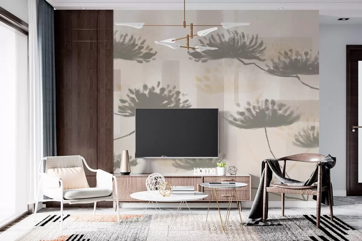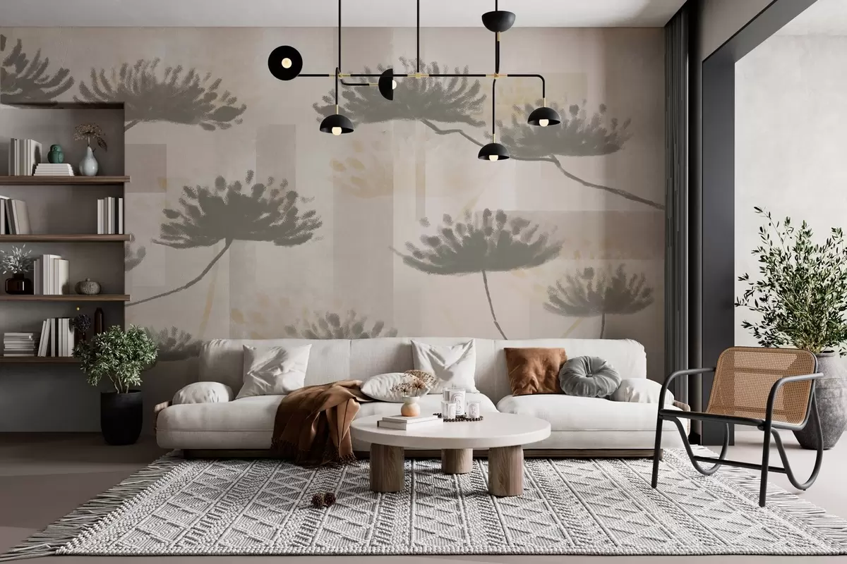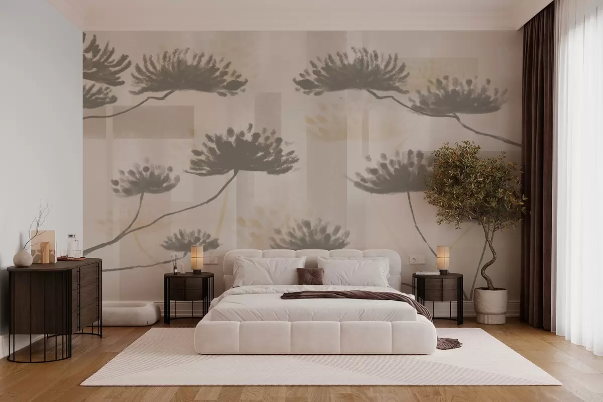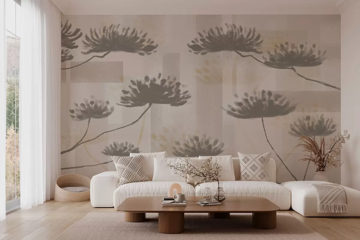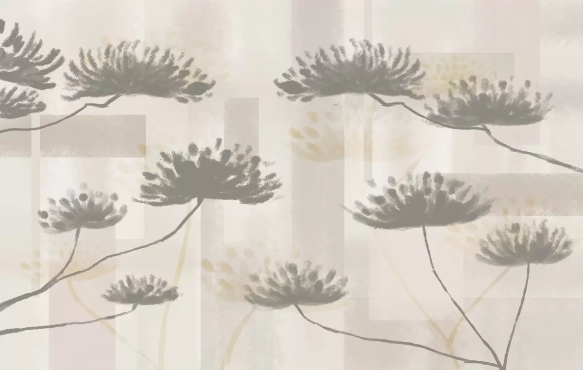 Wall murals textured geometry in beige and cream tones with stylized umbrella flowers Nr. w03960