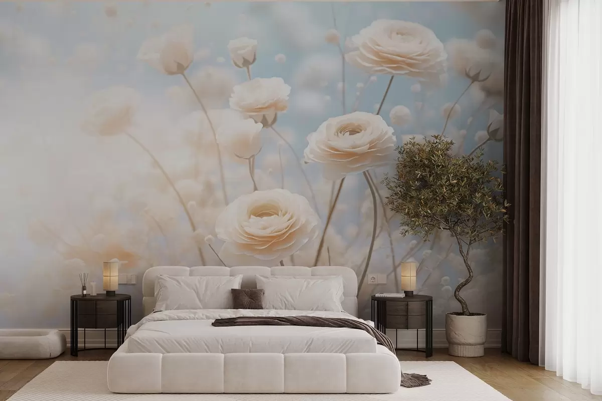 Wall murals Delicate cream roses on a light blue background Nr. w03997