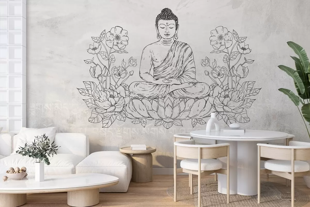Wall murals Meditating Buddha with lotus flowers, line art, oriental, beige background Nr. w04008v1