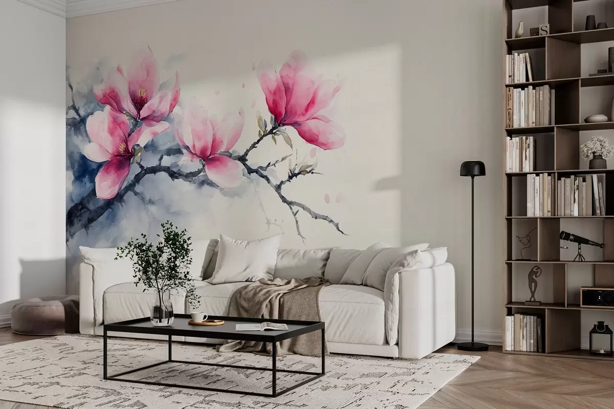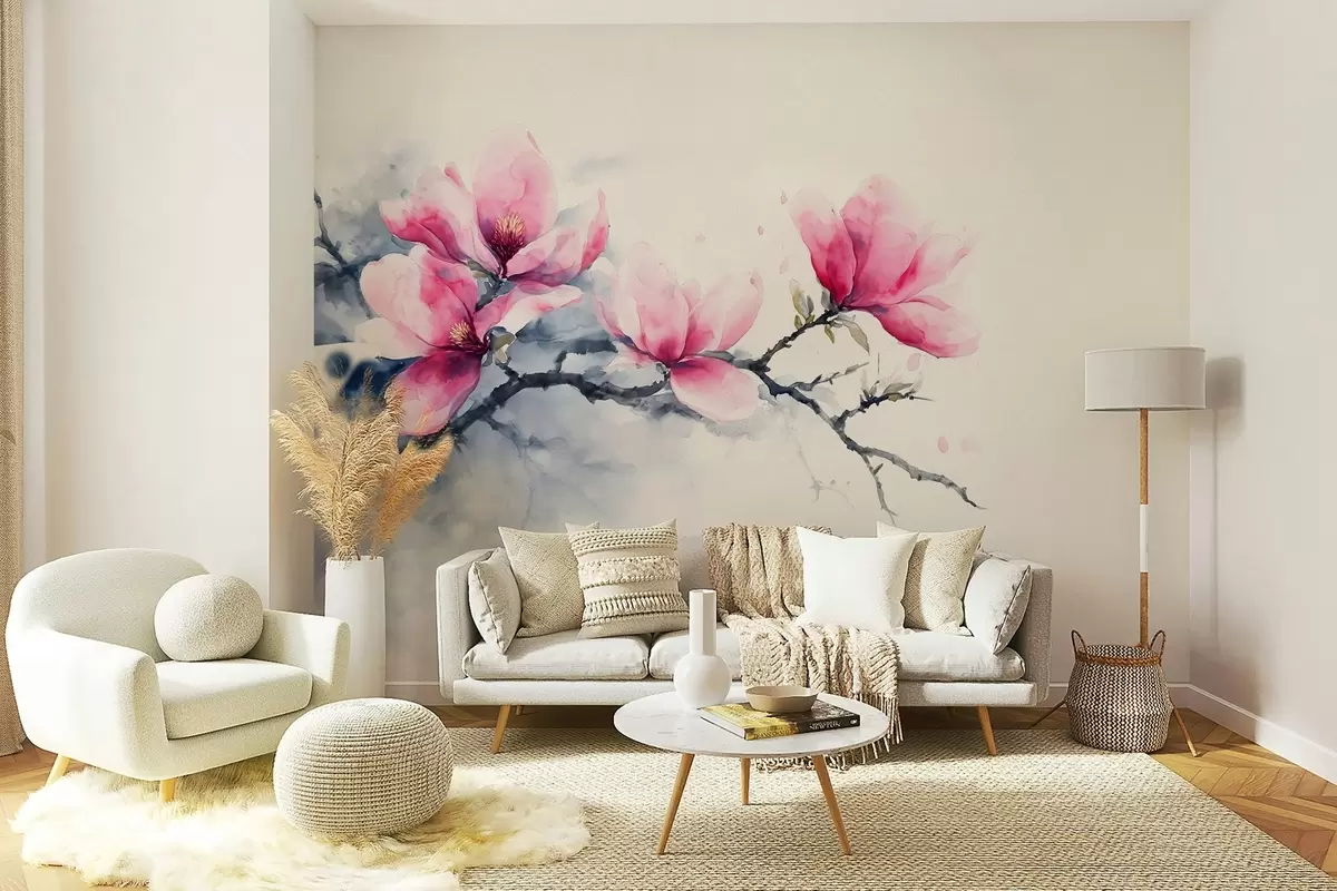Wall murals blooming branch of pink magnolia on an ivory background Nr. w04027
