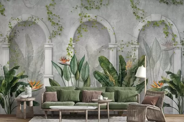 Wall murals Concrete wall with arches and tropical plants, floral, natural colors Nr. w04065