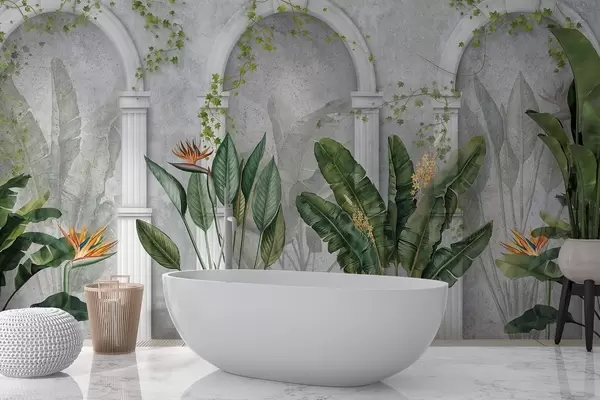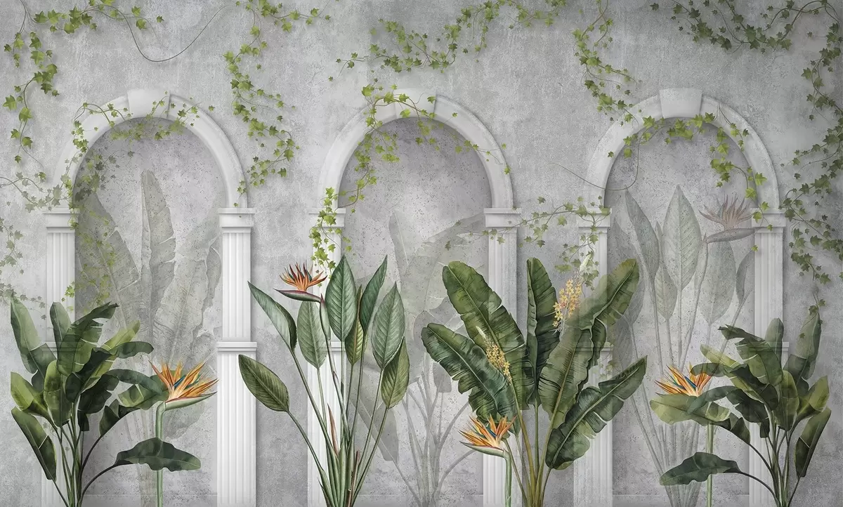 Wall murals Concrete wall with arches and tropical plants, floral, natural colors Nr. w04065