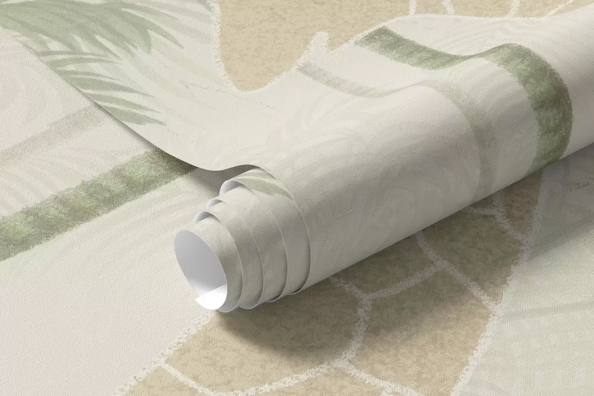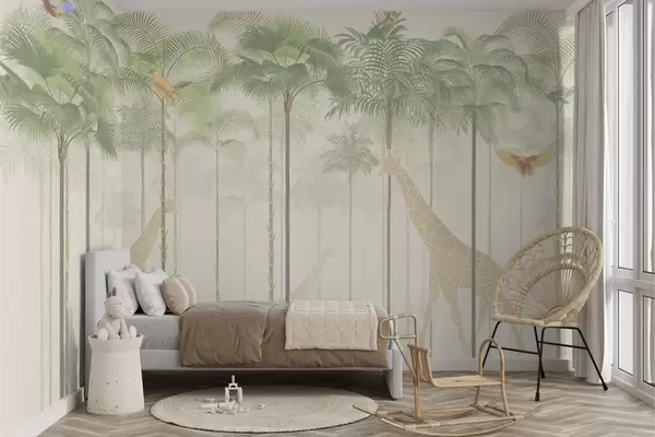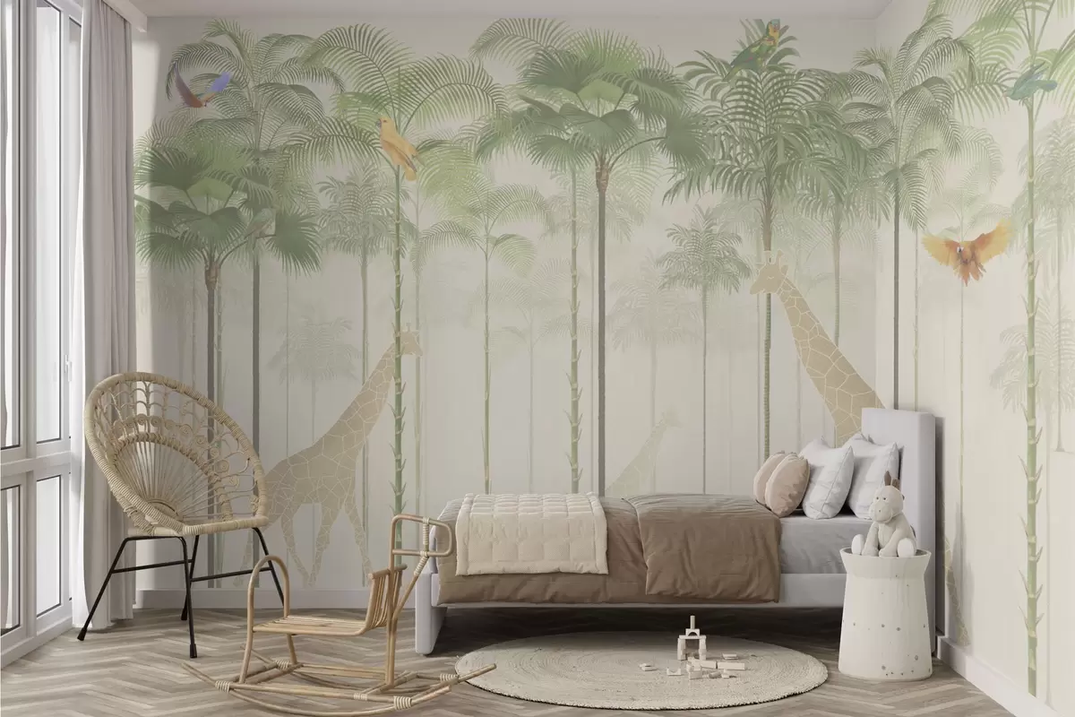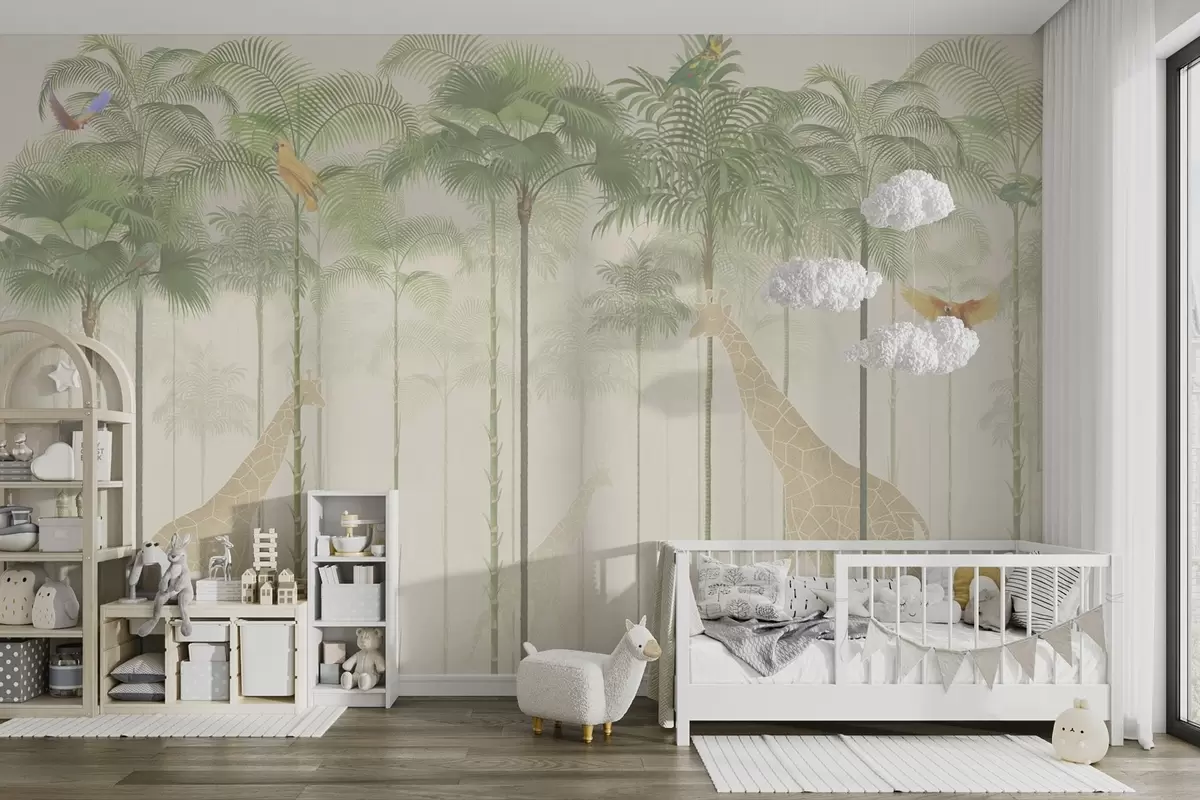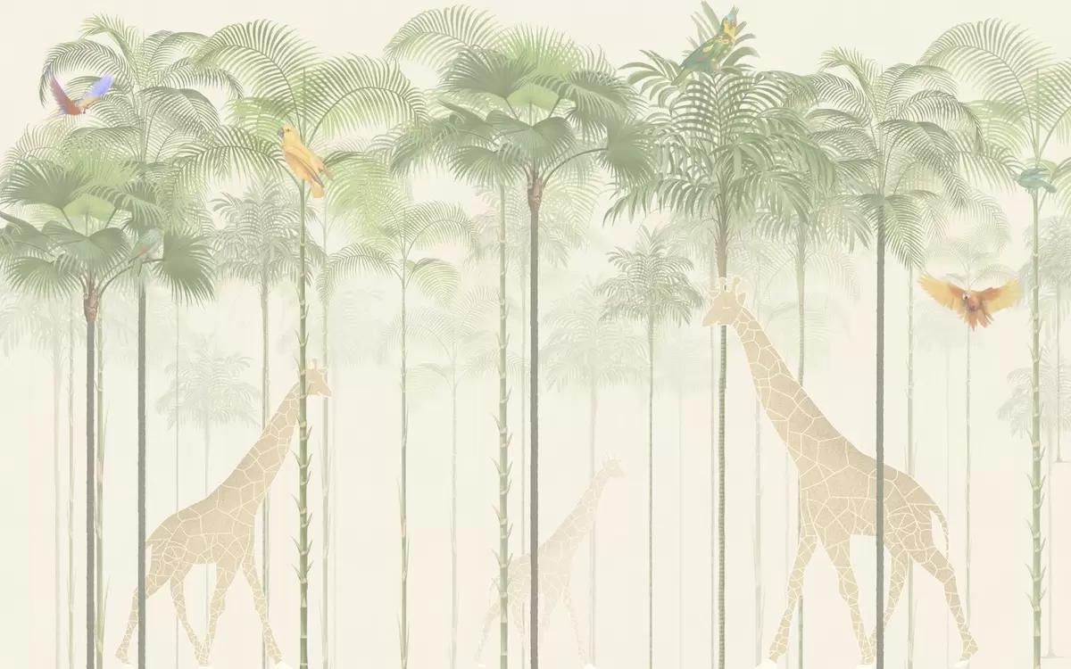 Wall murals Giraffes and tropical birds among tall palm trees Nr. w04400