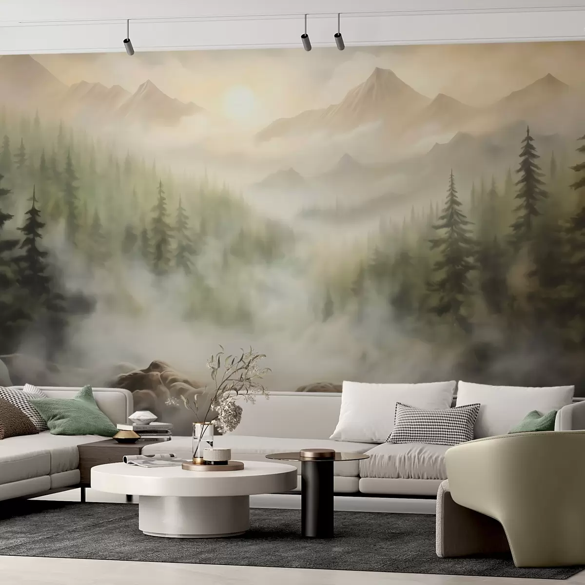 Wall murals Forest in the fog against the backdrop of mountains Nr. w04730