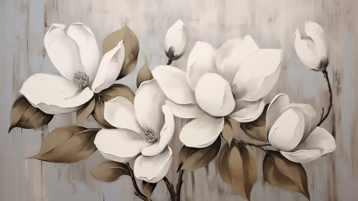Wall murals Large magnolia blossoms with taupe leaves on brushed backdrop Nr. w04785