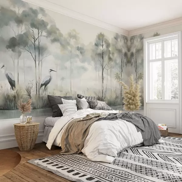 Wall murals Misty forest by the water with herons, soft cool palette Nr. w04788