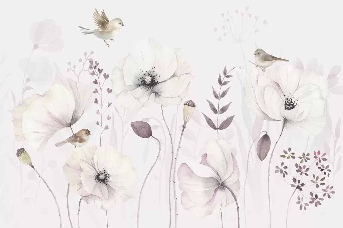 Wall murals Watercolor poppies with small birds in soft mauve Nr. w04861