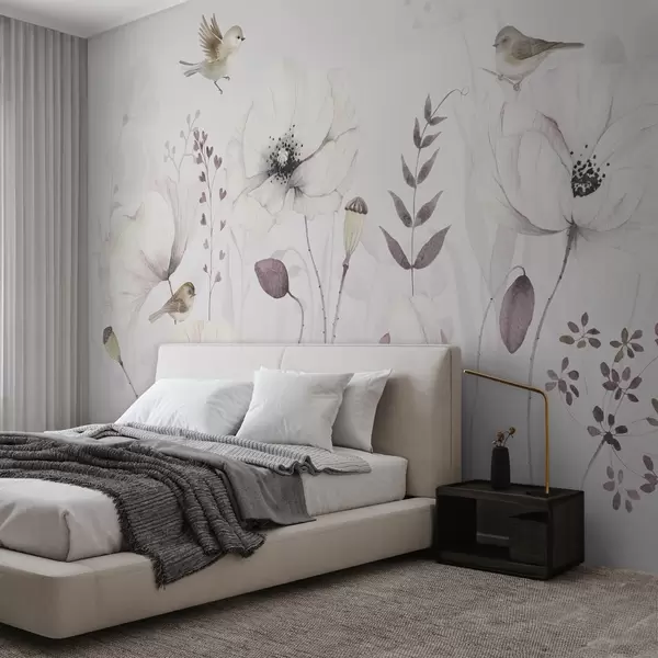 Wall murals Watercolor poppies with small birds in soft mauve Nr. w04861