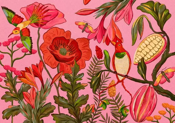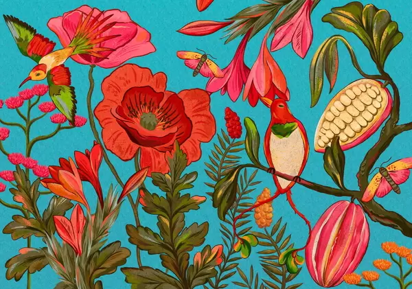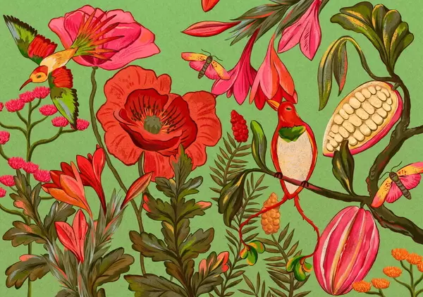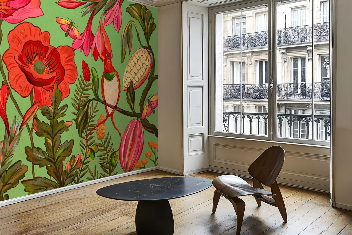 Wall murals Decorative flowers and birds on green background Nr. w05036v1